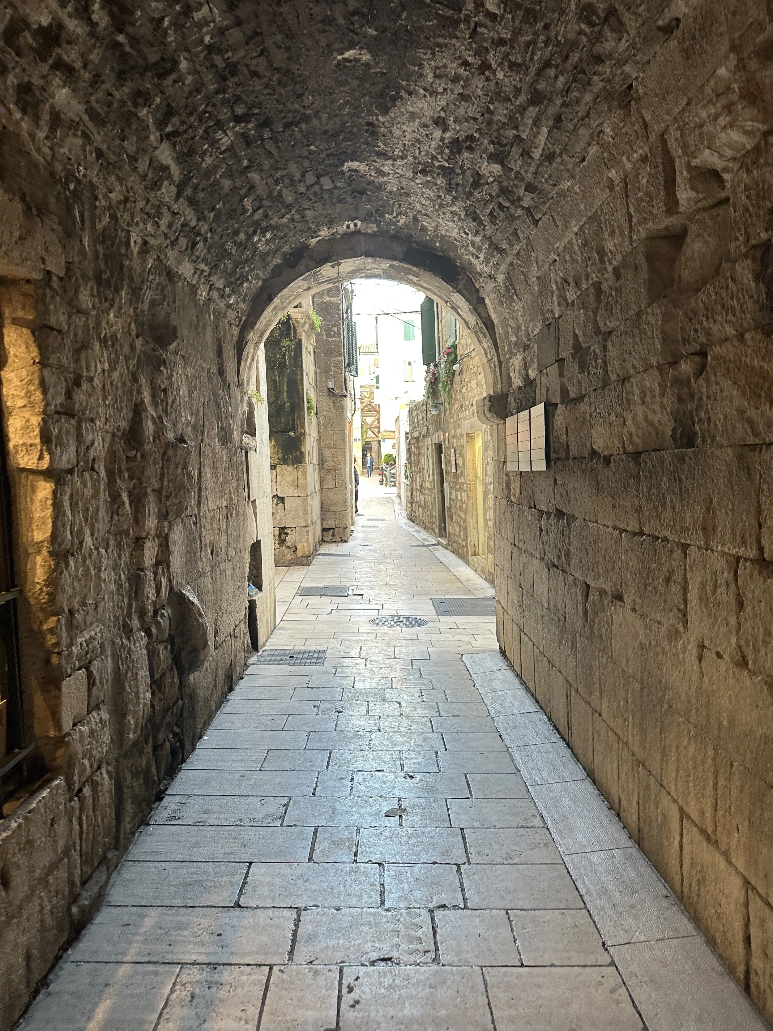 To get to the heart of the palace, we walked through this tunnel, right outside our door. Old Town Split has many tunnels and arched entries. The town has so much character! In this photo, we are walking away from our apartment. Our door is right behind me… along with three restaurants and a coffee cafe.