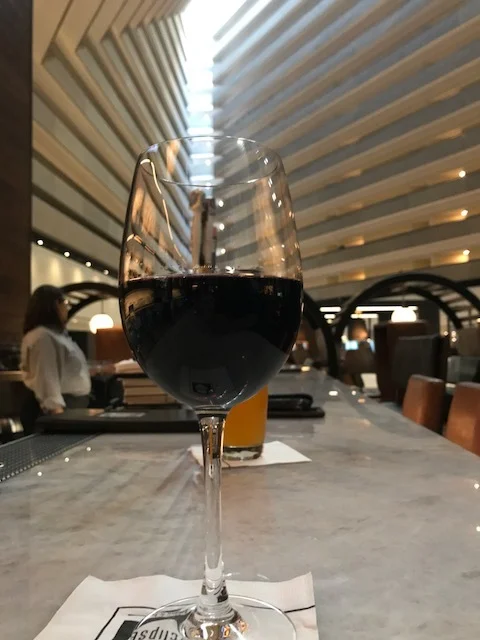 The lobby of the Embarcadero is so nice, we didn't even make it back to our room. We decided to make a pitstop! We nestled in a cozy booth in the lobby bar. The architecture of the hotel is a unique half pyramid shape. As expected, the service was excellent.