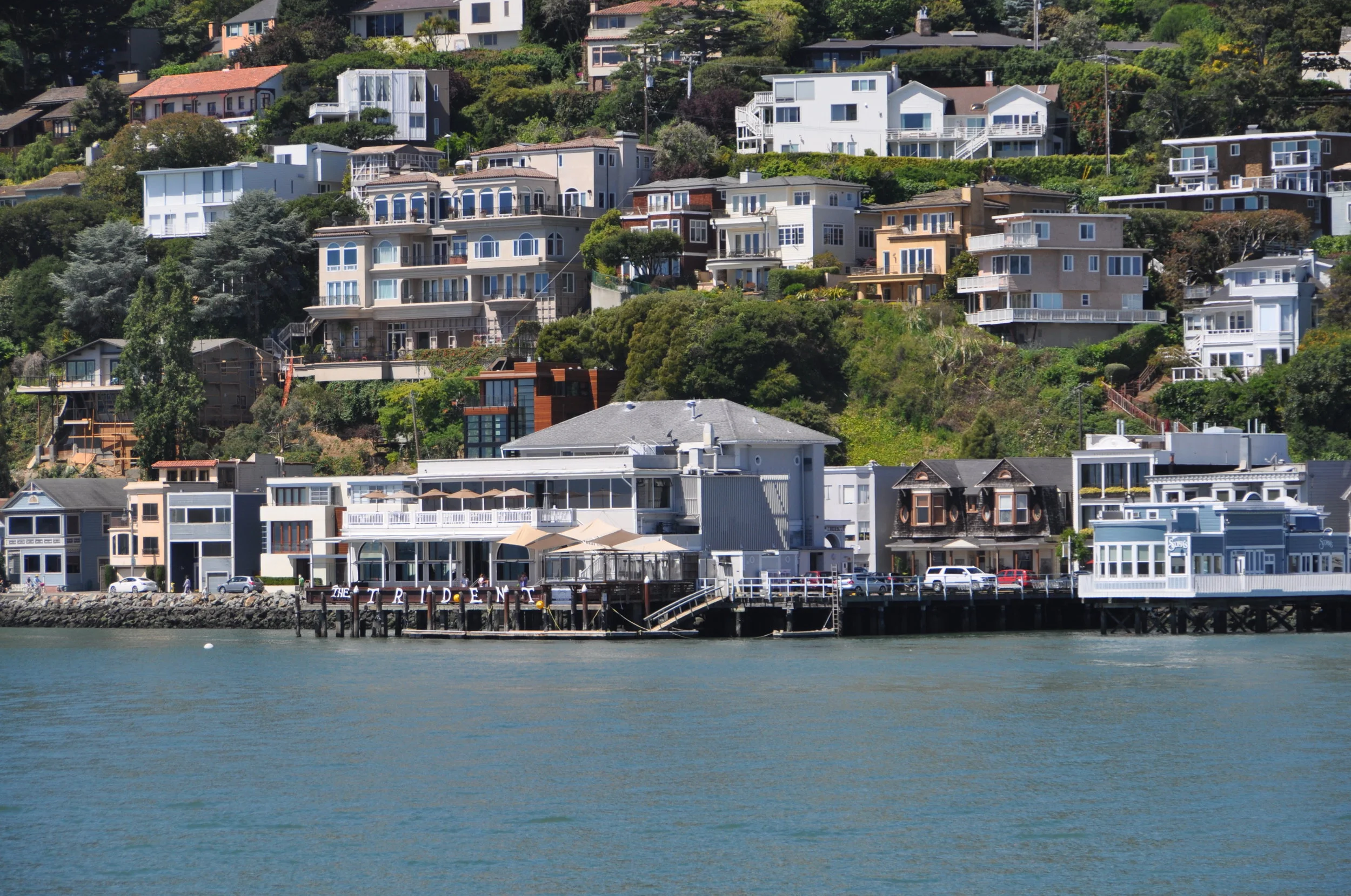 Pulling closer, we begin to see the bars and shops that make up the quaint town of Tiburon.