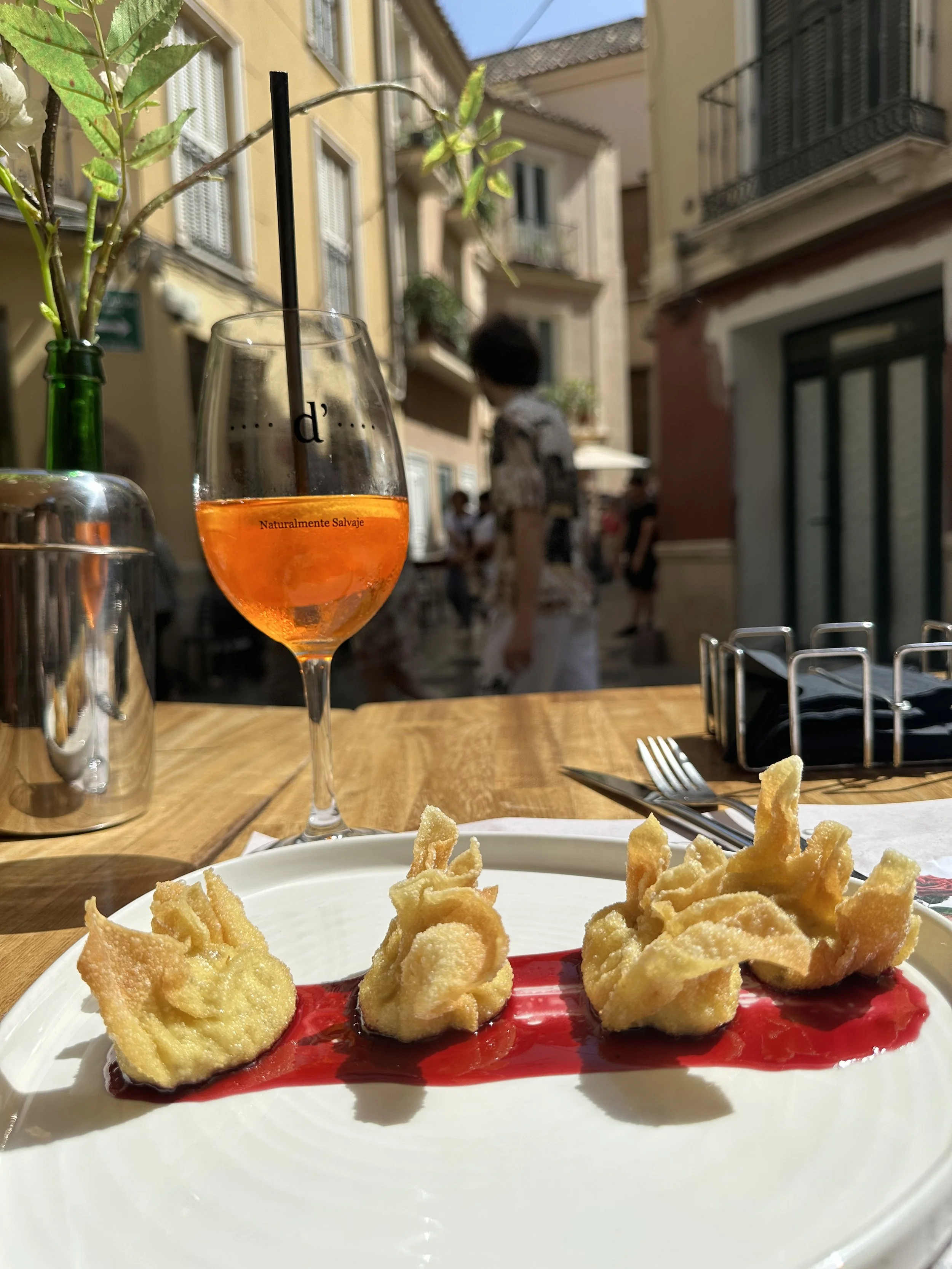 My last Malaga meal was at D’Platos. Having eaten at this restaurant a few times on this trip and in the past, I was anxious to enjoy this amazing dish one more time! The waiter knew me from previous visits and served me a couple of complimentary treats. He was fully aware of my dietary restrictions. This was a gluten free wonton… stuffed with feta cheese and diced walnuts. Sitting in a raspberry sauce made this a taste sensation! Arriving early, before the crowds, I was able to sit for quite some time and enjoy the sights.