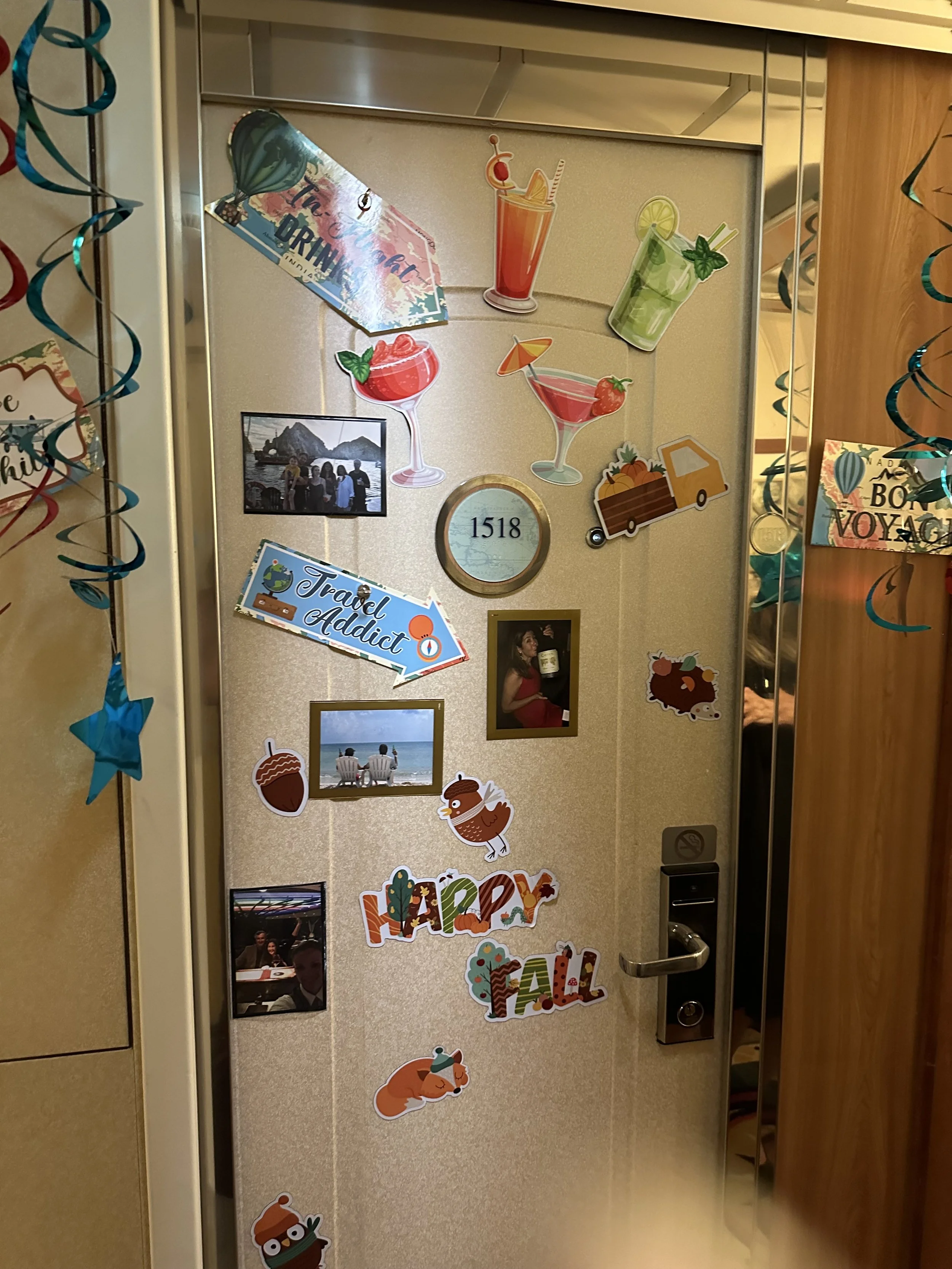 As usual, my first course of action is decorating the cabin door! Makes it very easy to locate the room since they all look the same. Swirlies, magnets and festive decorations. It’s fall so we have the “fall theme”. Could be considered a bit cluttered, but it makes me happy… so cluttered it is!