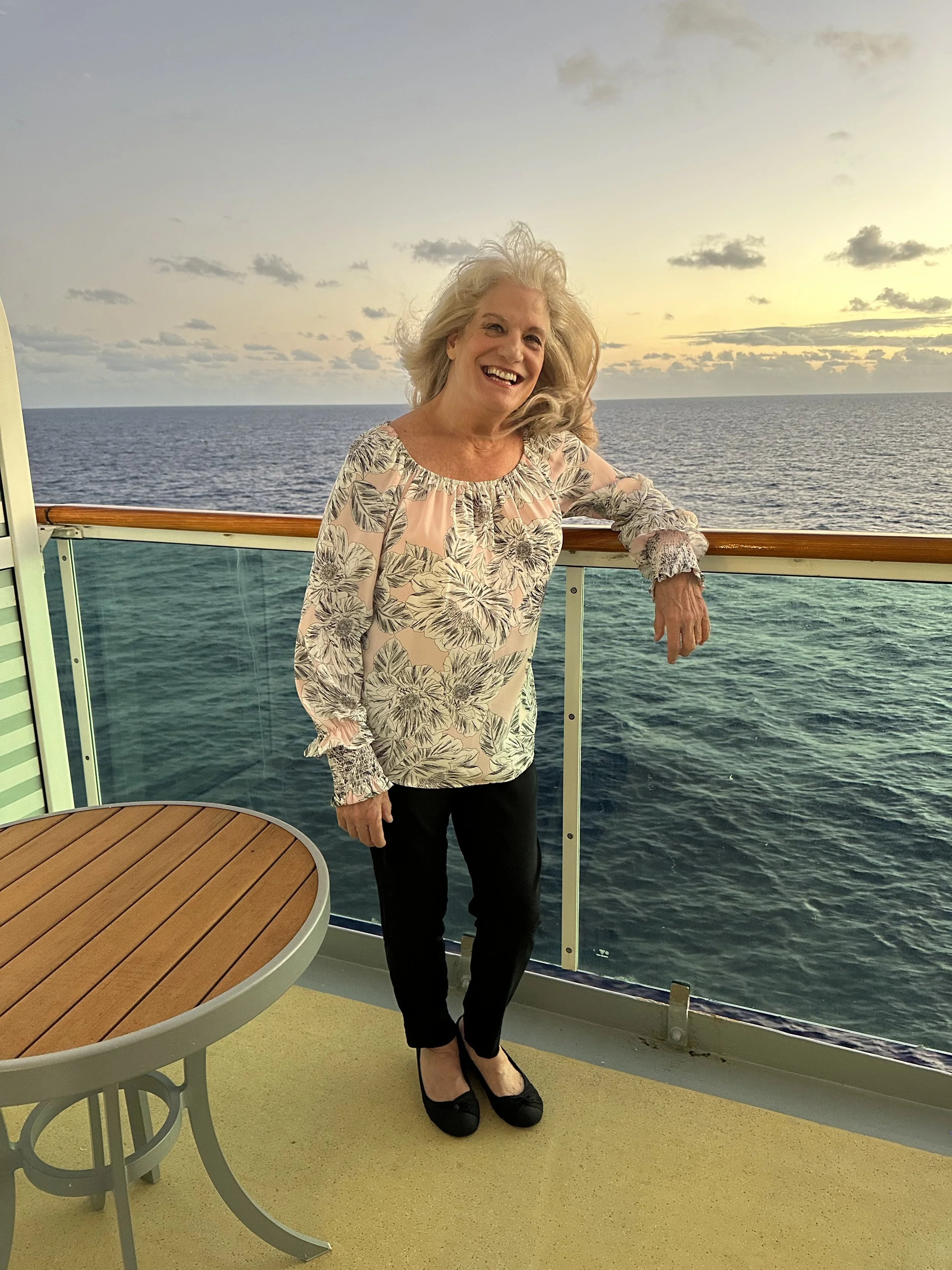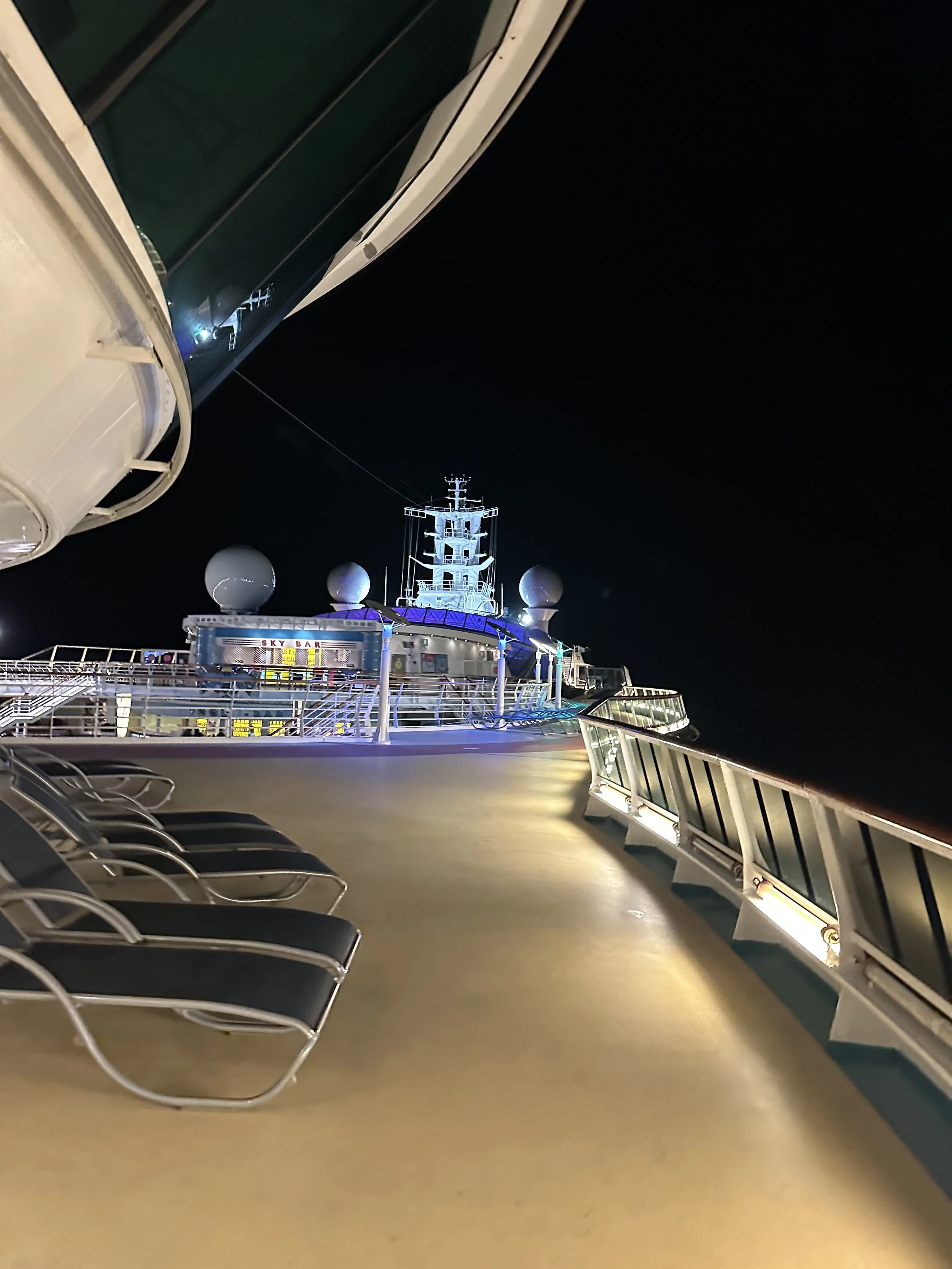 Windy but warm, the walk back to our cabins was perfect! I love life at sea! To be able to wander on a ship deck, knowing you’re safe. No worries about finding parking, dealing with car rentals or reservations (all ours were made on day one). Depending on one’s mood, there are so many activites: shows, trivia, music, games. It’s a great life!