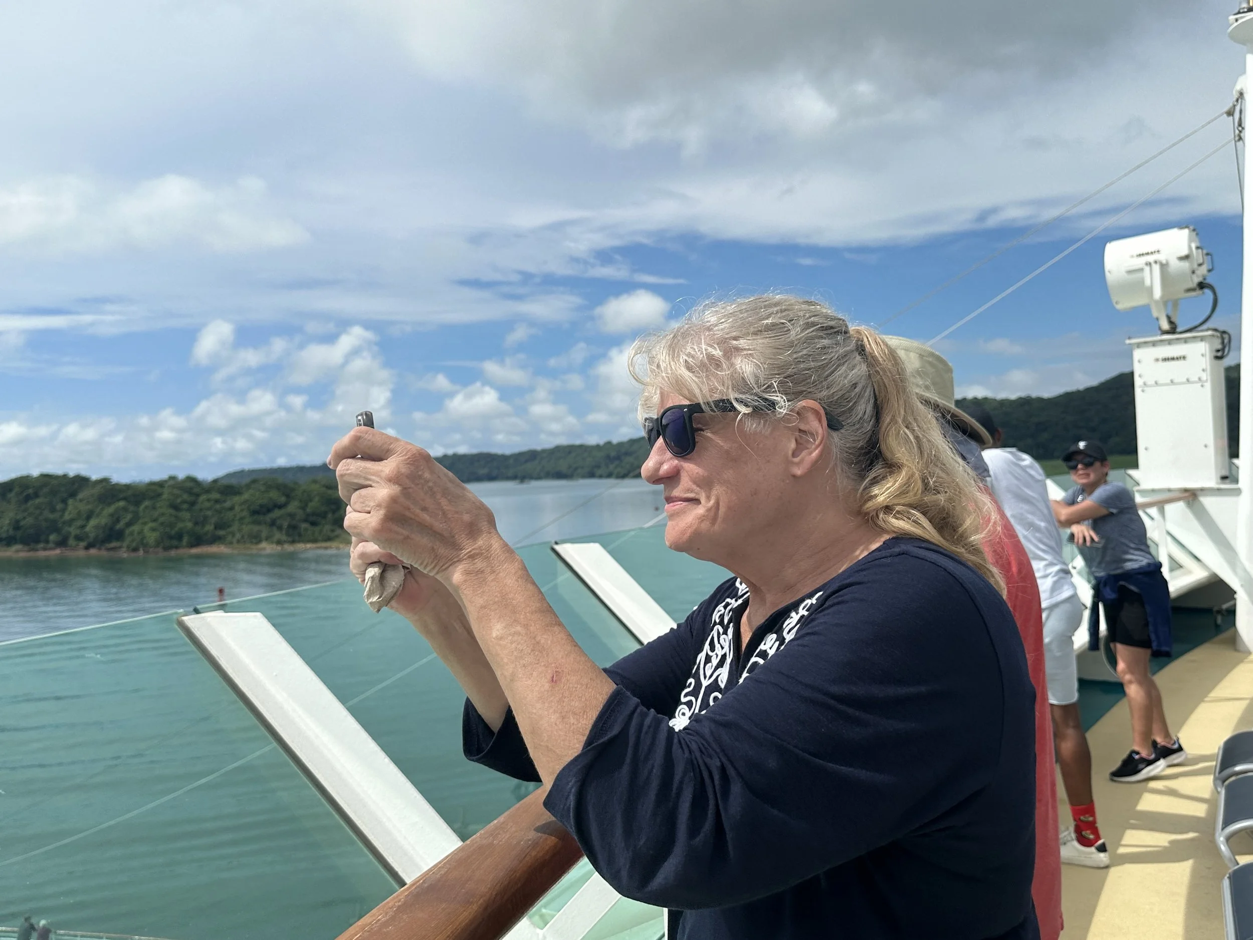 Taken through the window, Chris is happily sitting at the table ready to eat his sushi! Roxanne was in a spot with too much glare so I couldn’t get an outdoor photo of her. But we are at the table, ready to eat some delicious sushi as we pass through the Panama Canal.