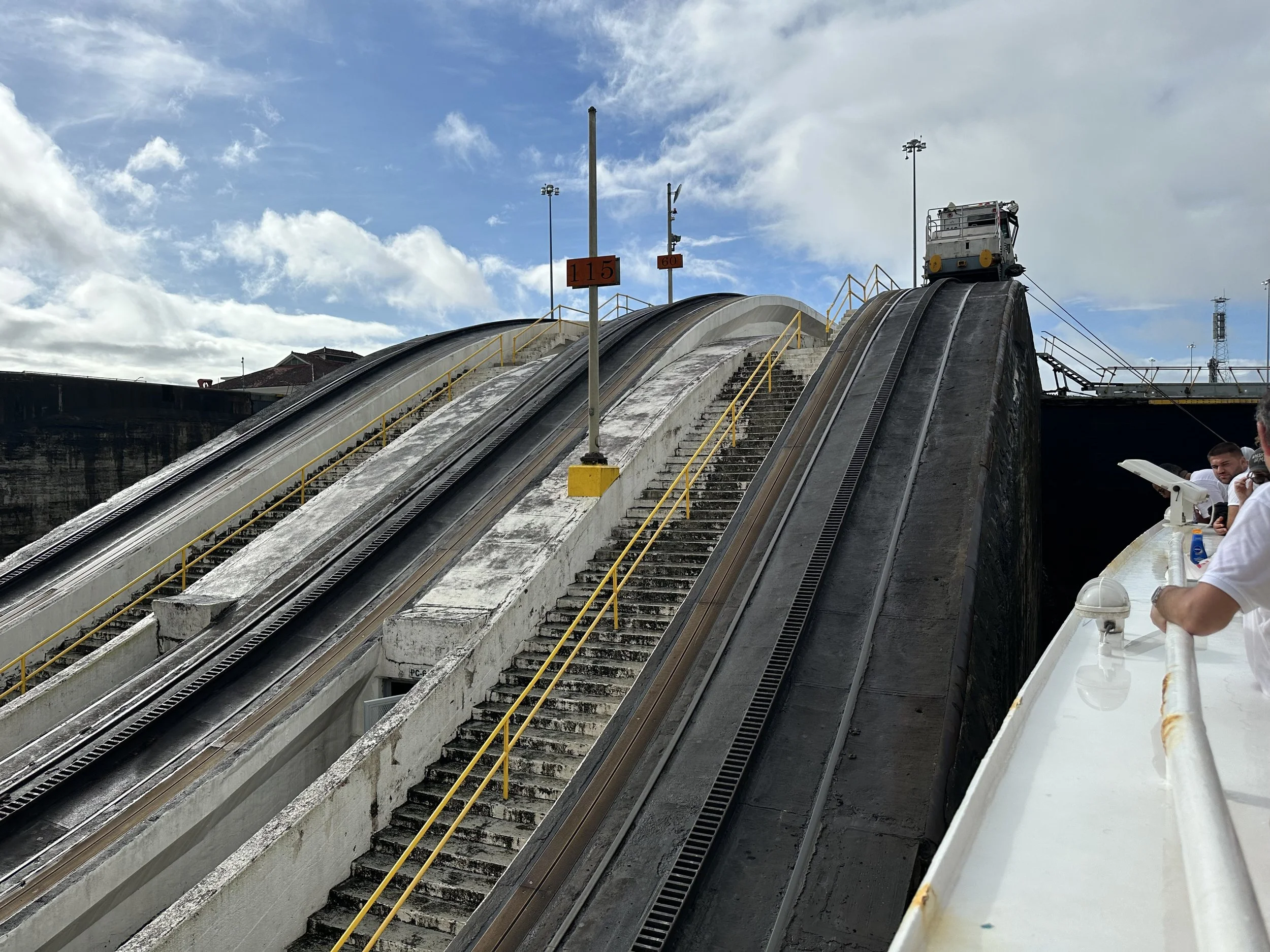 Now cooled off a bit after another visit to the cabin, I headed for the back of the ship. Looking to review our progress, this is a perspective I love! We reached the Pedro Miguel Locks and will be lowered until we eventually reach Pacific Ocean sea level. This shows how high we were and how low we are so far…