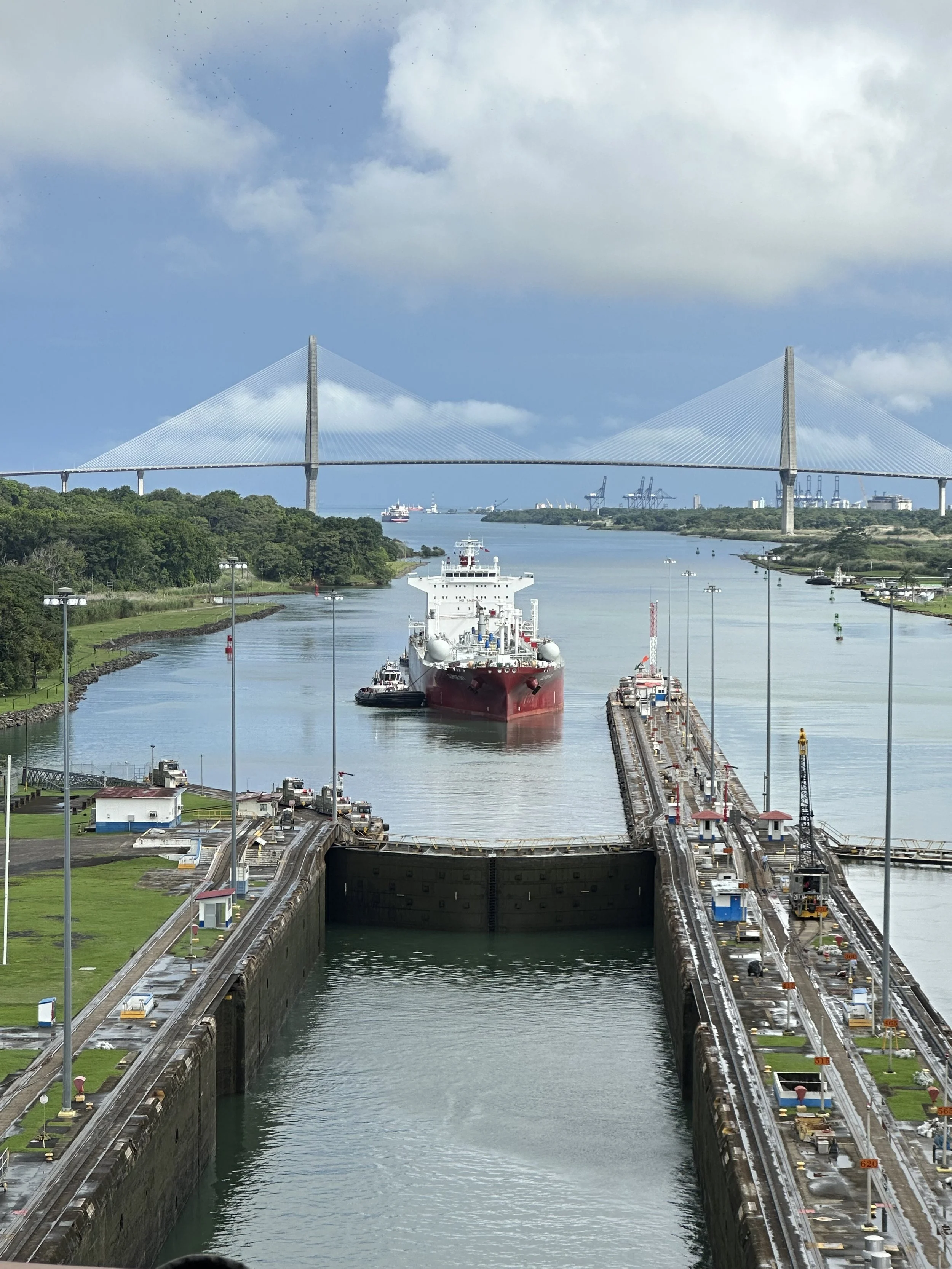 Side by side with another vessel, we prepare for the first set of locks to fill with water and lift us a total of 85 feet. By days end, we will have completed three steps at Gatun, a single step at Pedro Miguel and a two steps at Miraflores.