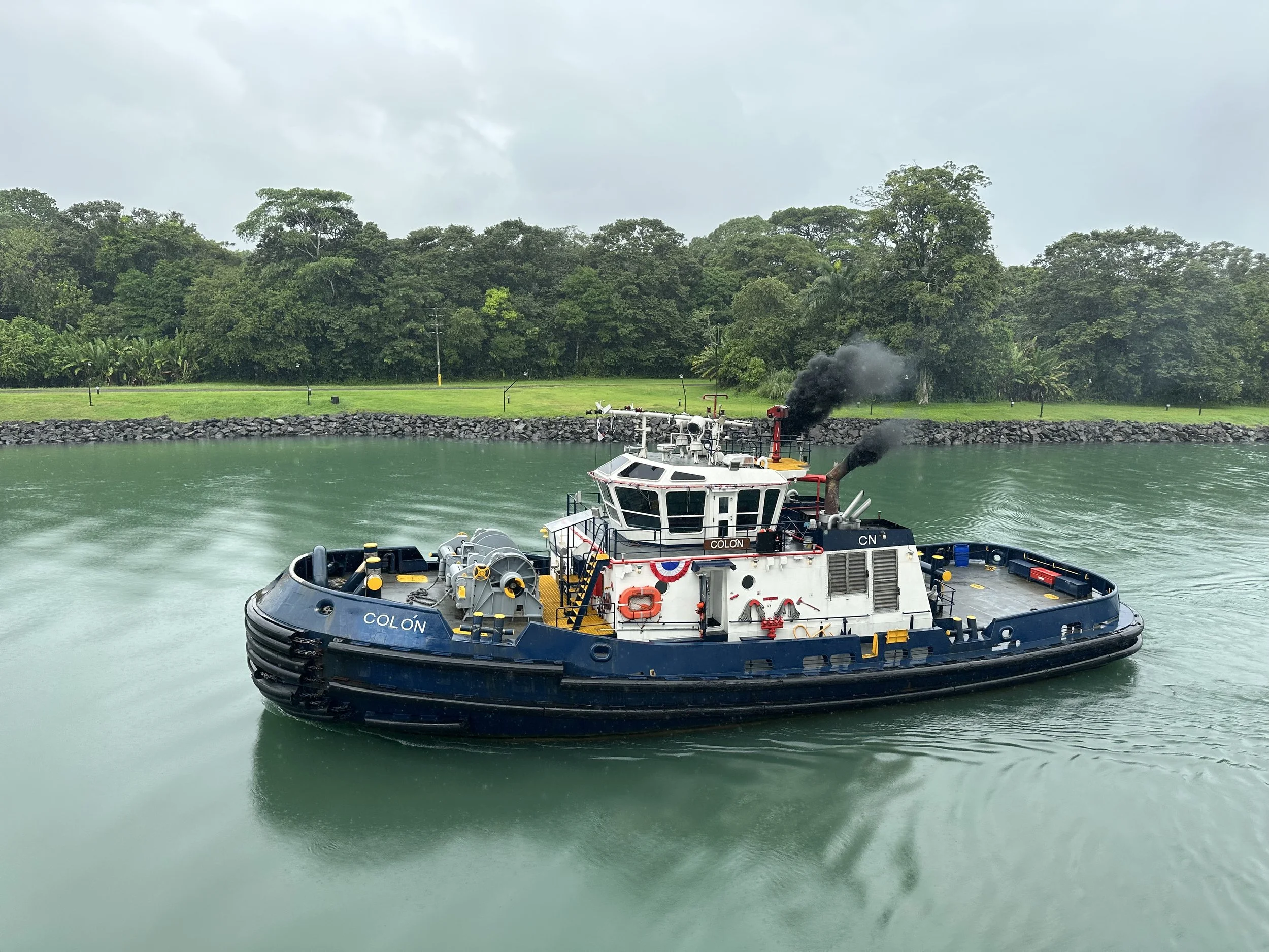 Coming up on the starbird side of our ship, a boat carrying the two pilots who would board to guide us through the canal. As you can see, the weather was a bit sketchy… our plan was to view entering the first set of locks from the helipad on Deck 5 forward. These views from our cabin… our very dry cabin… seemed a better idea but hey, you only live once. What’s a litle water!