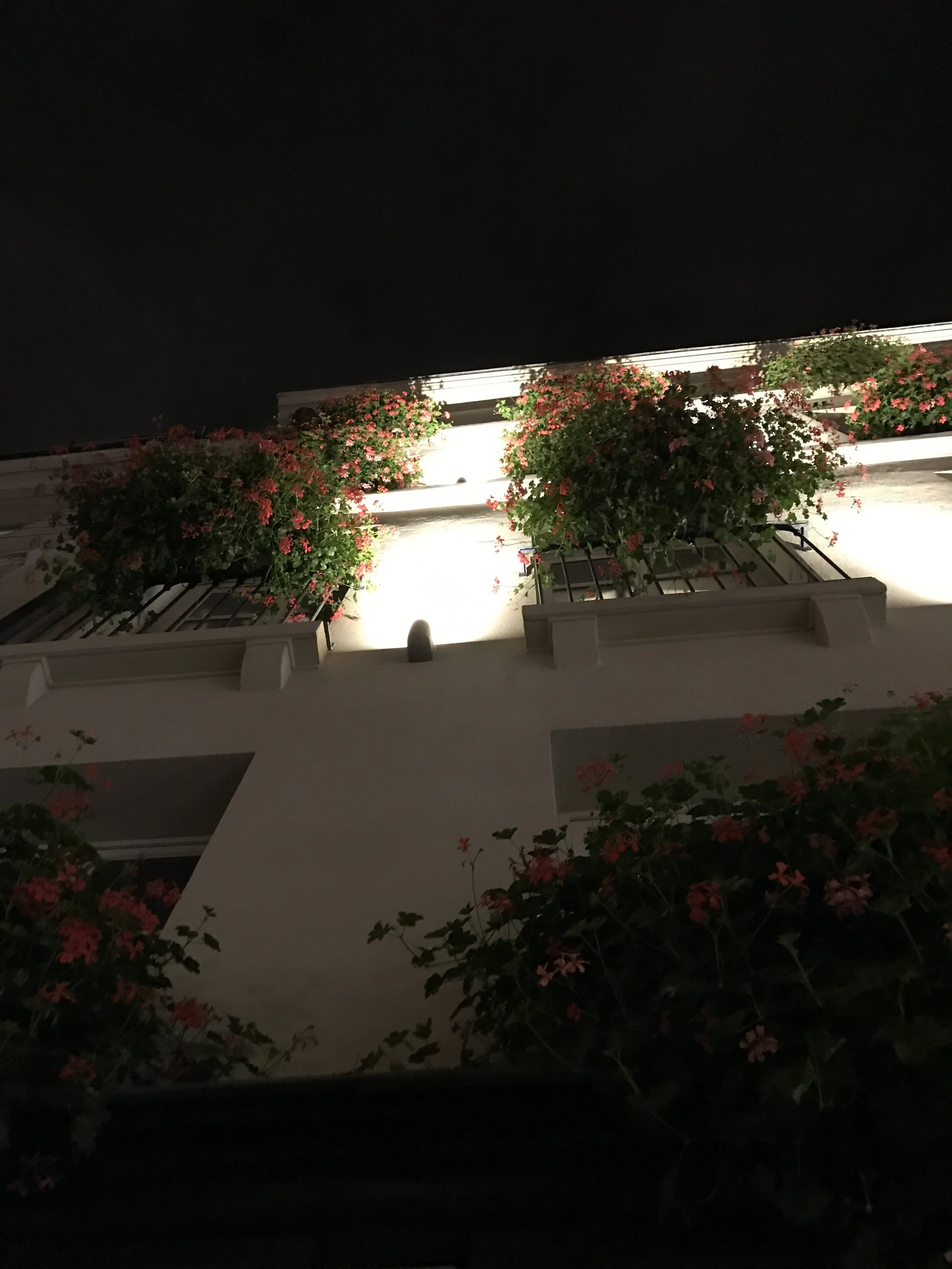On our way to dinner, we passed this beautiful building with flower boxes all the way up the side. They were in full bloom despite being fall.