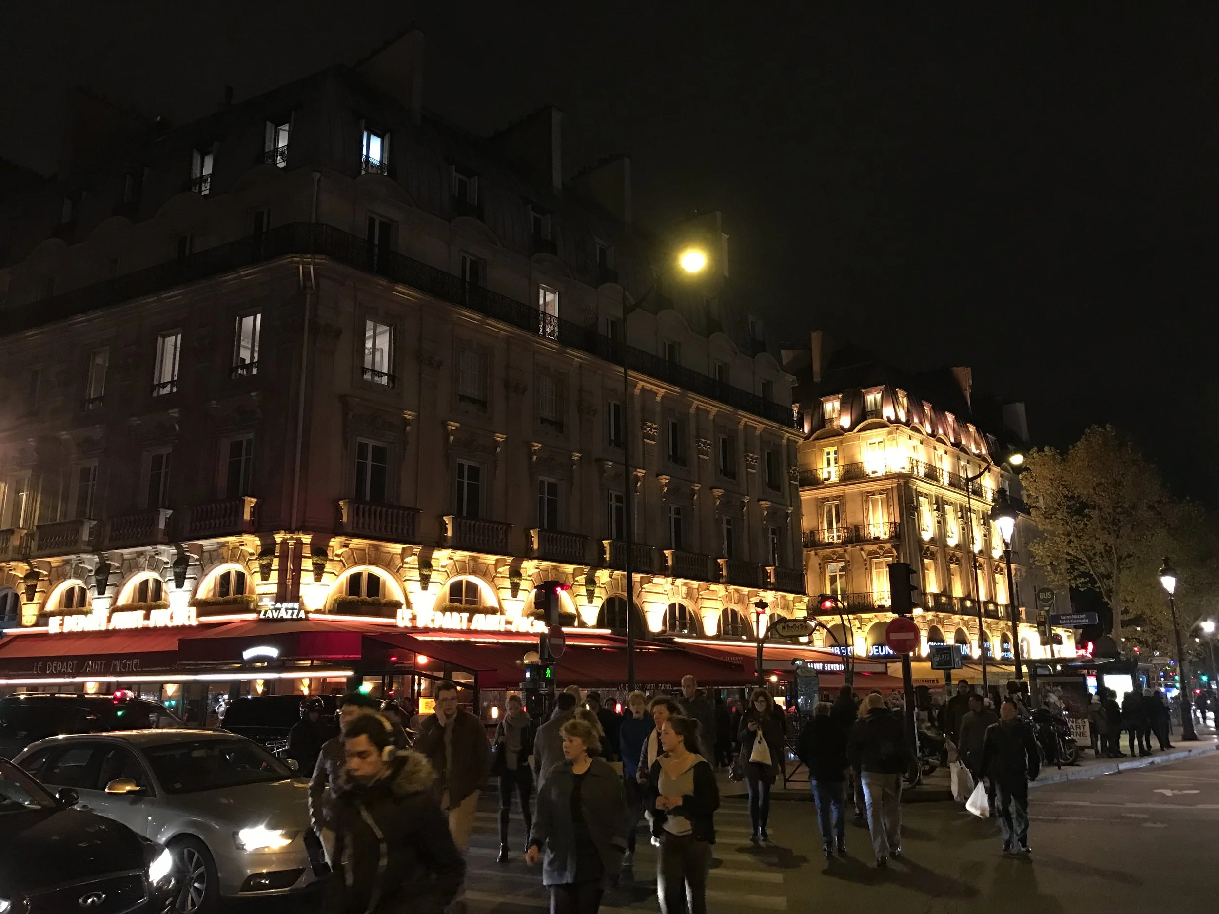 Walking toward our restaurant, we crossed over the Seine and approached Notre Dame from the other side. The grand lighting accentuated the intricate carvings in this incredible building. The spires, pillars roofline stood out as we walked along the Left Bank.