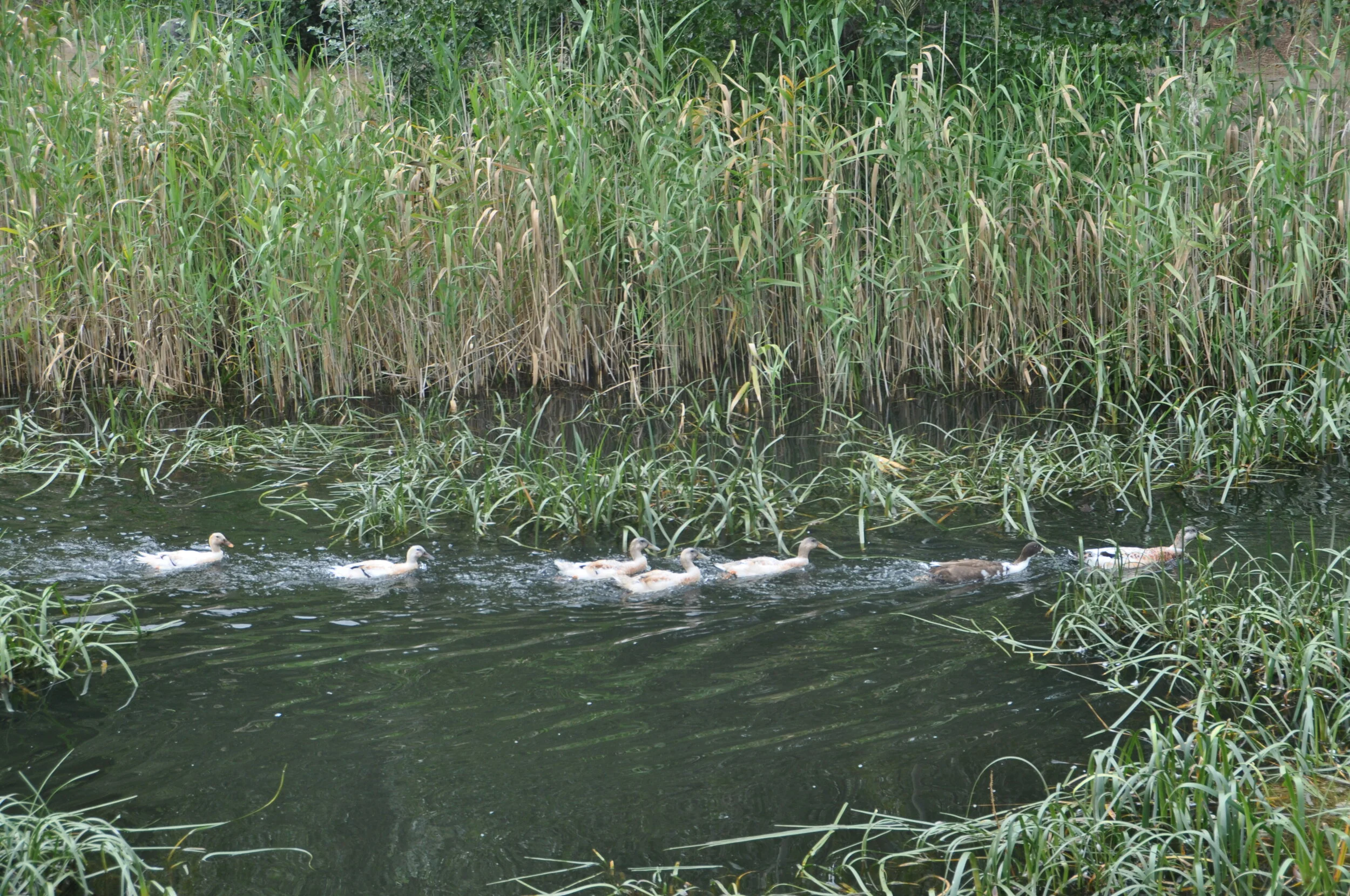 Peacefully swimming beneath the bridge, these ducks saw a potential for food and traveled together toward it. A couple brought a bag of duck food to the water's edge and fed these hungry ducks!