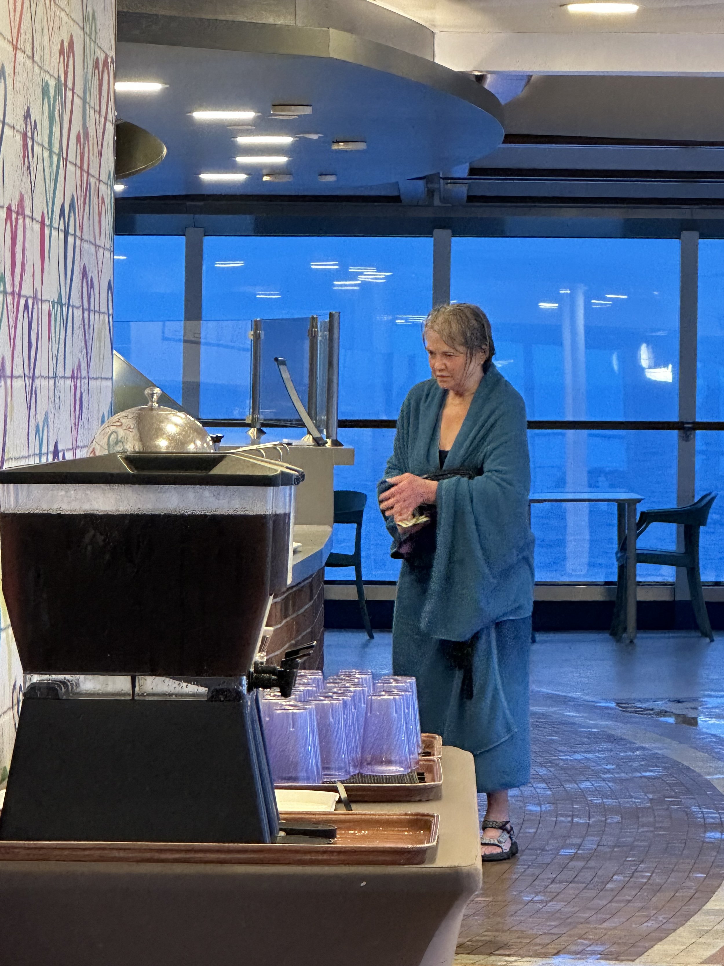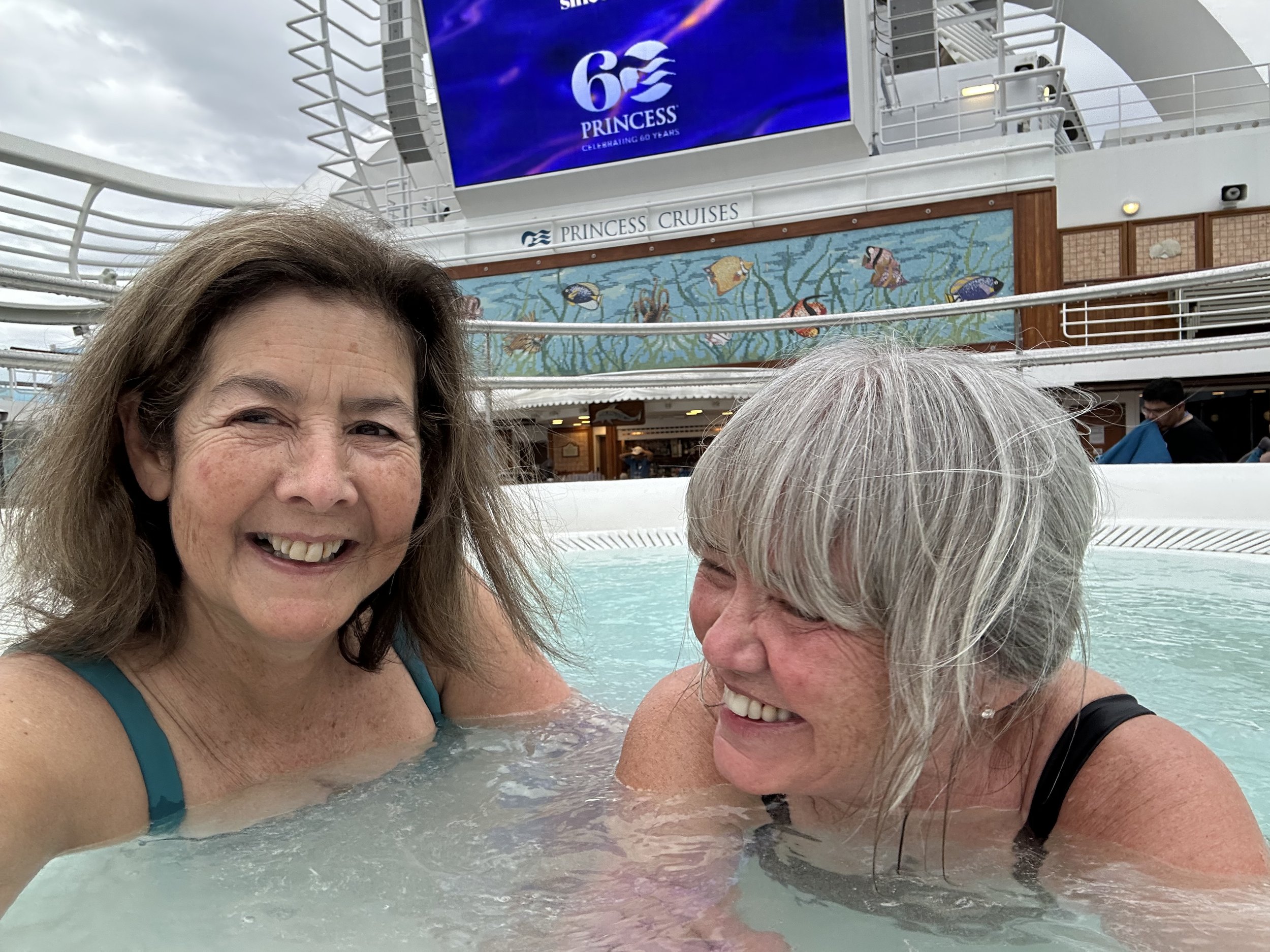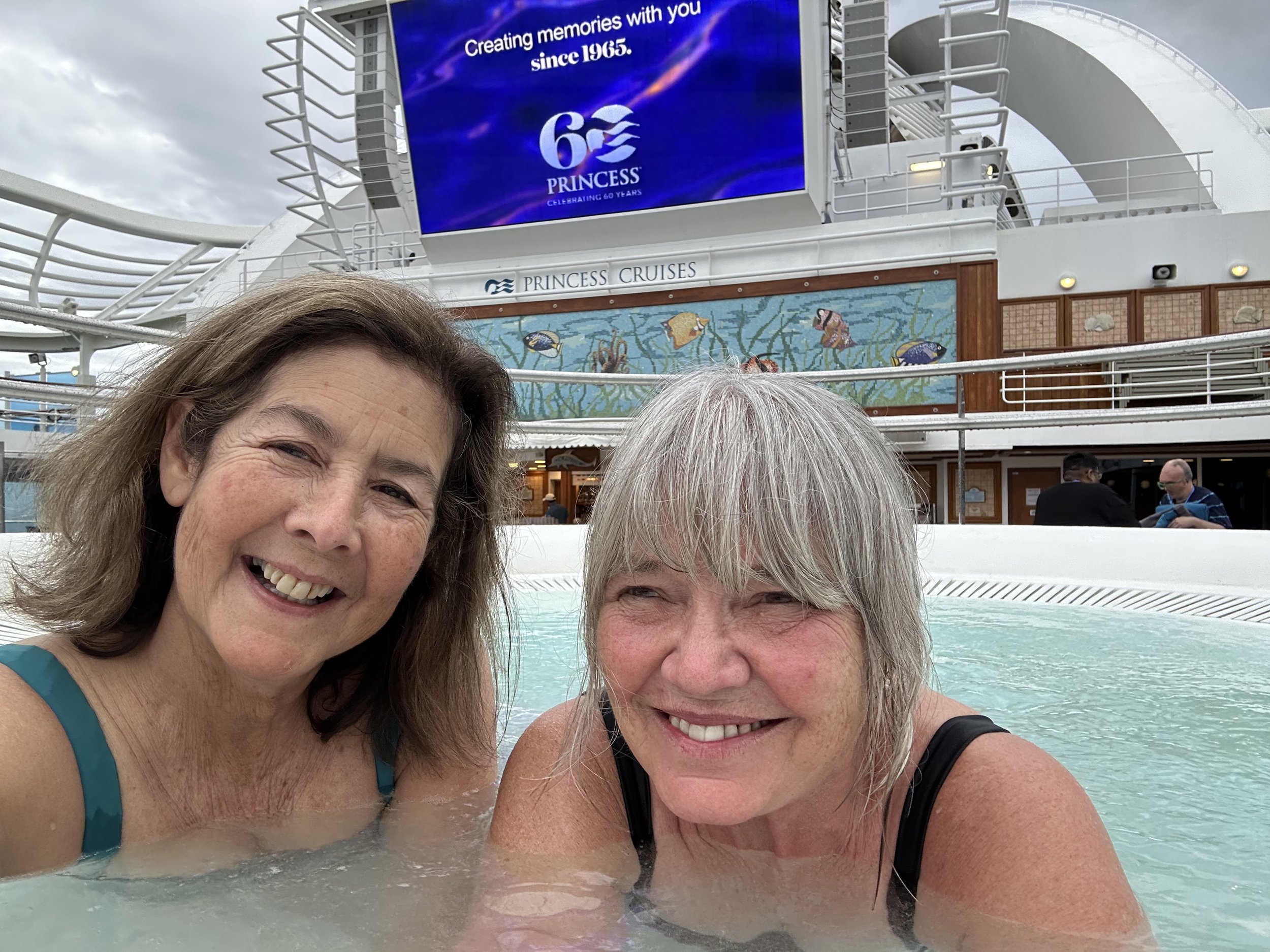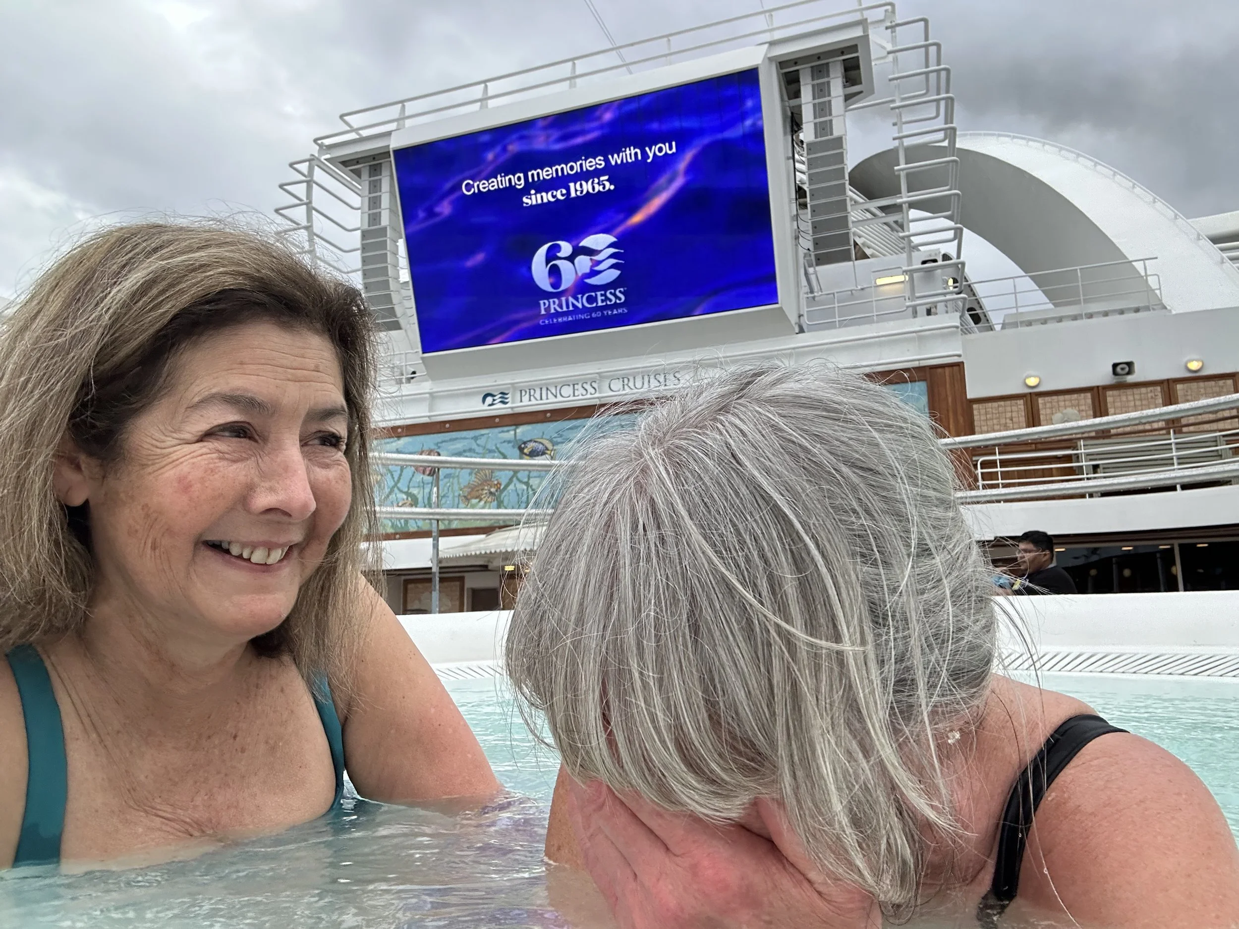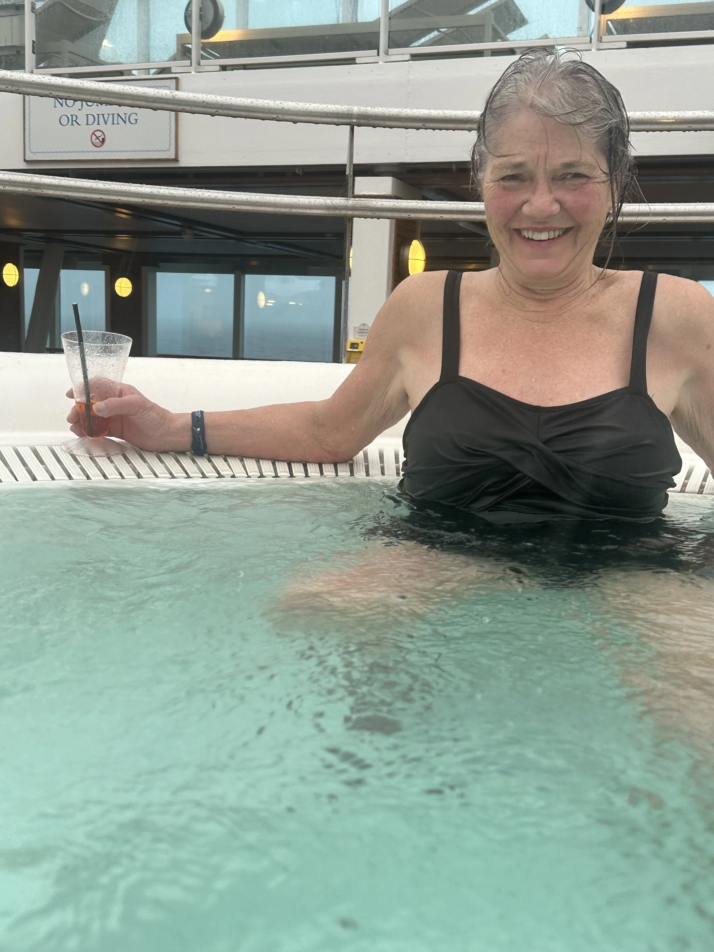 With the water being a perfect temperature and the weather being slightly chilly, this was an excellent spot to spend the afternoon! We ordered Aperol Spritz and soaked for quite a while. Our sail so far has been very smooth (much smoother than expected) and the clouds overhead made it feel like we needed a hot tub. Halfway through our relaxing jacuzzi, the raindrops began to fall. Of course, we were already wet so there was no need to jump out. By the time the movie ended, we were drenched!