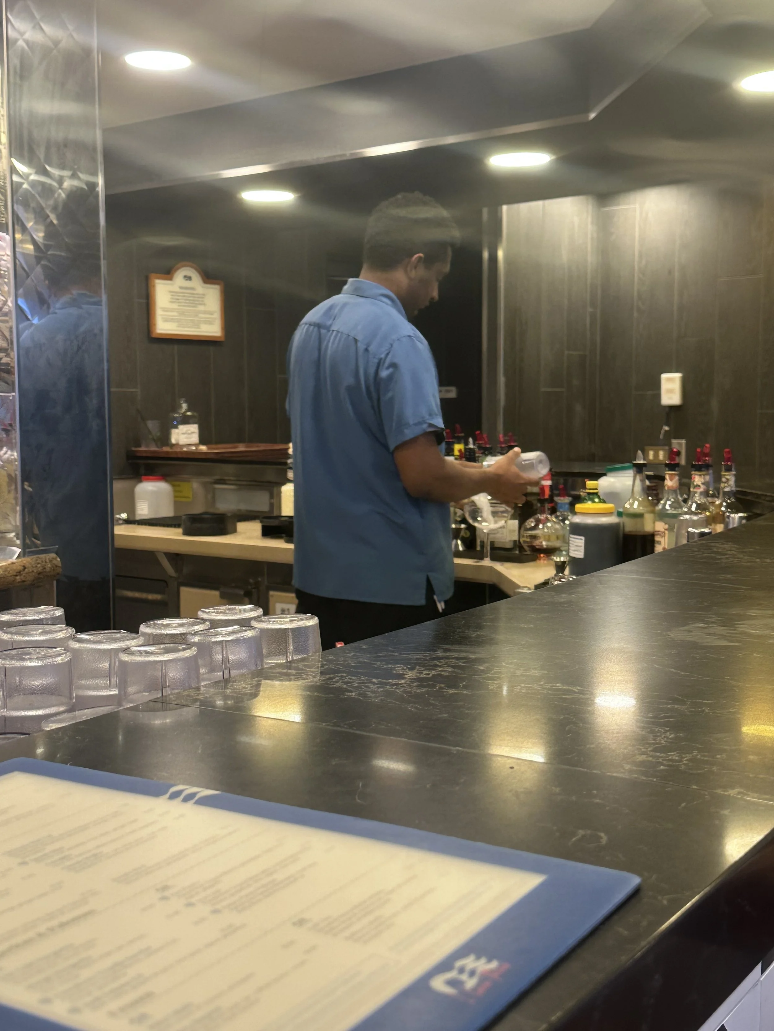 Once out of the water, Lori decided to grab some french fries and a sandwich from the poolside grill. As for me? It was too close to dinner, so I grabbed a cocktail from the lonely bartender. I shouldn’t say lonely… people always say I look lonely when standing on a dead blackjack game. My typical response is, “I’m alone but not lonely”… So, to correct myself, I decided to grab a cocktail from the bartender standing alone.