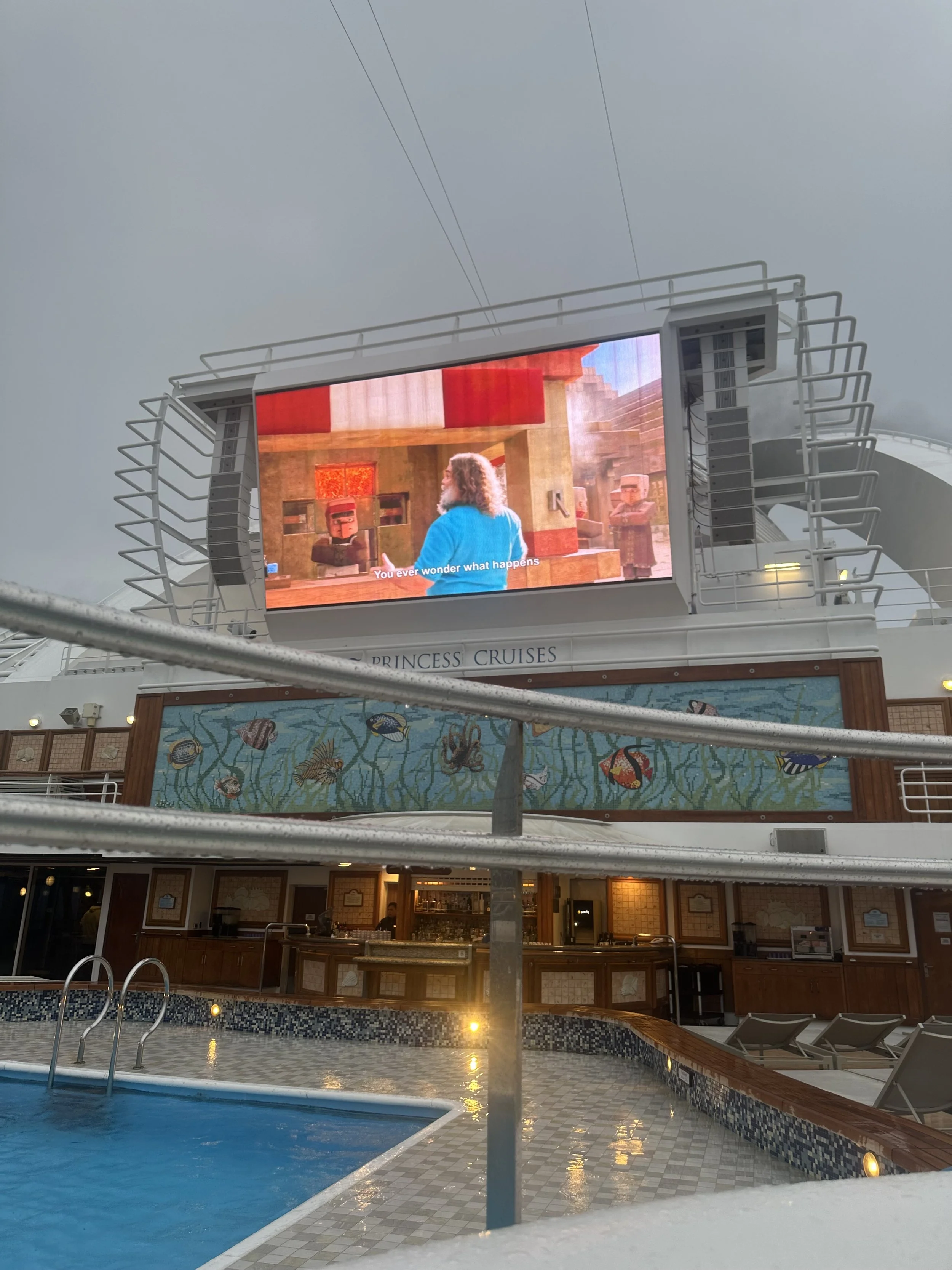 After losing at every game we attempted, it was time for a little R&R. Out on the pool deck, one section has a movie screen. Along the side wall is a cart full of towels and cozy blankets. We decided to watch the movie from the hot tub. No one else was out at this time… The movie was Minecraft (my grandson would be jealous).