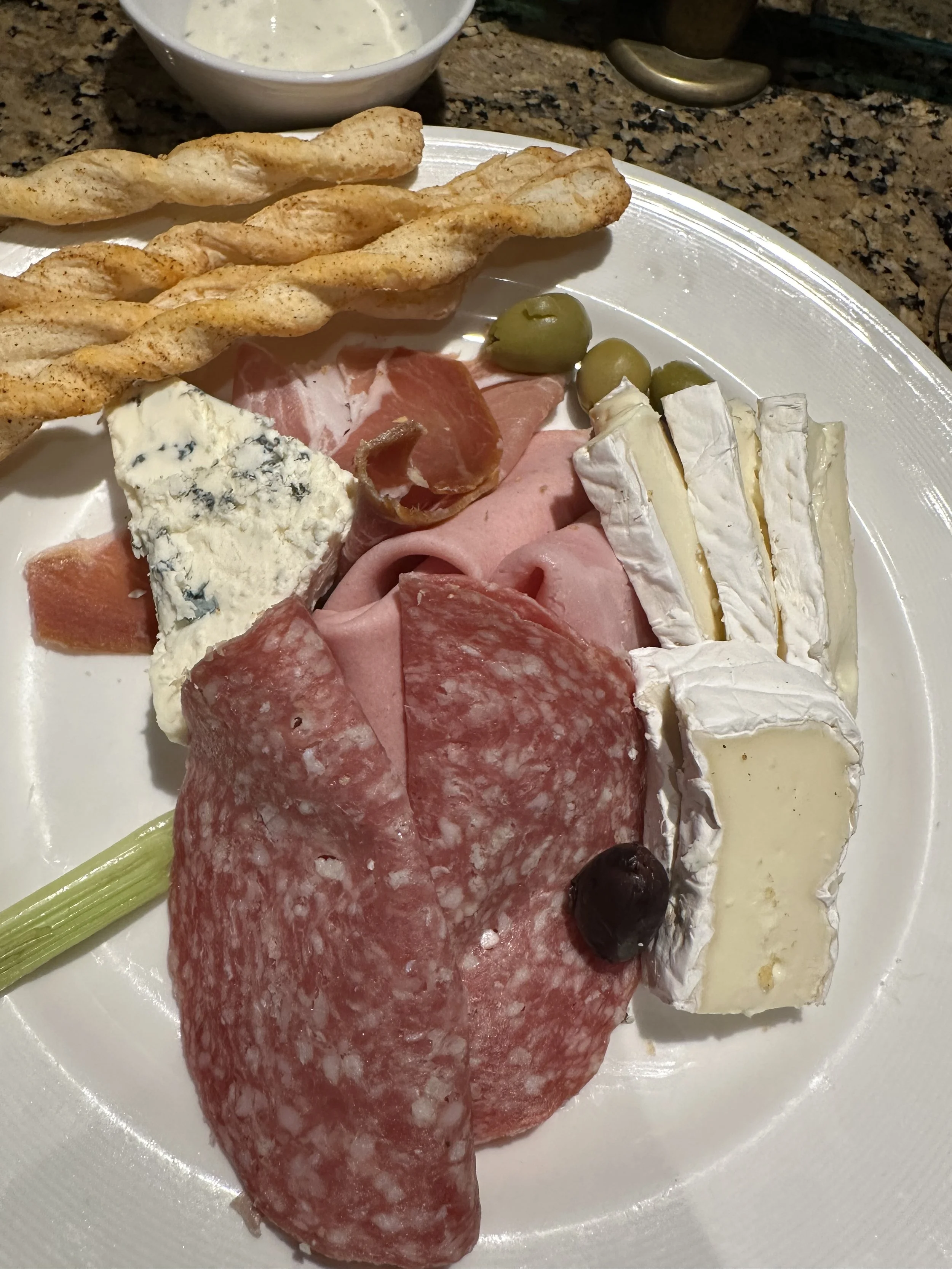 Since Lori ate her snack at such a late hour, I was on my own for dinner. Deciding to just make it simple, I went to Vine’s Wine Bar and ordered the charcuterie board. No bread sticks for me but the bartender brought some chopped veggies and ranch dressing. For dessert, decadent chocolate truffles. Sitting in a sea of rich chocolate syrup. Paired with a glass of Belle Glos, it was the perfect “simple” dinner.