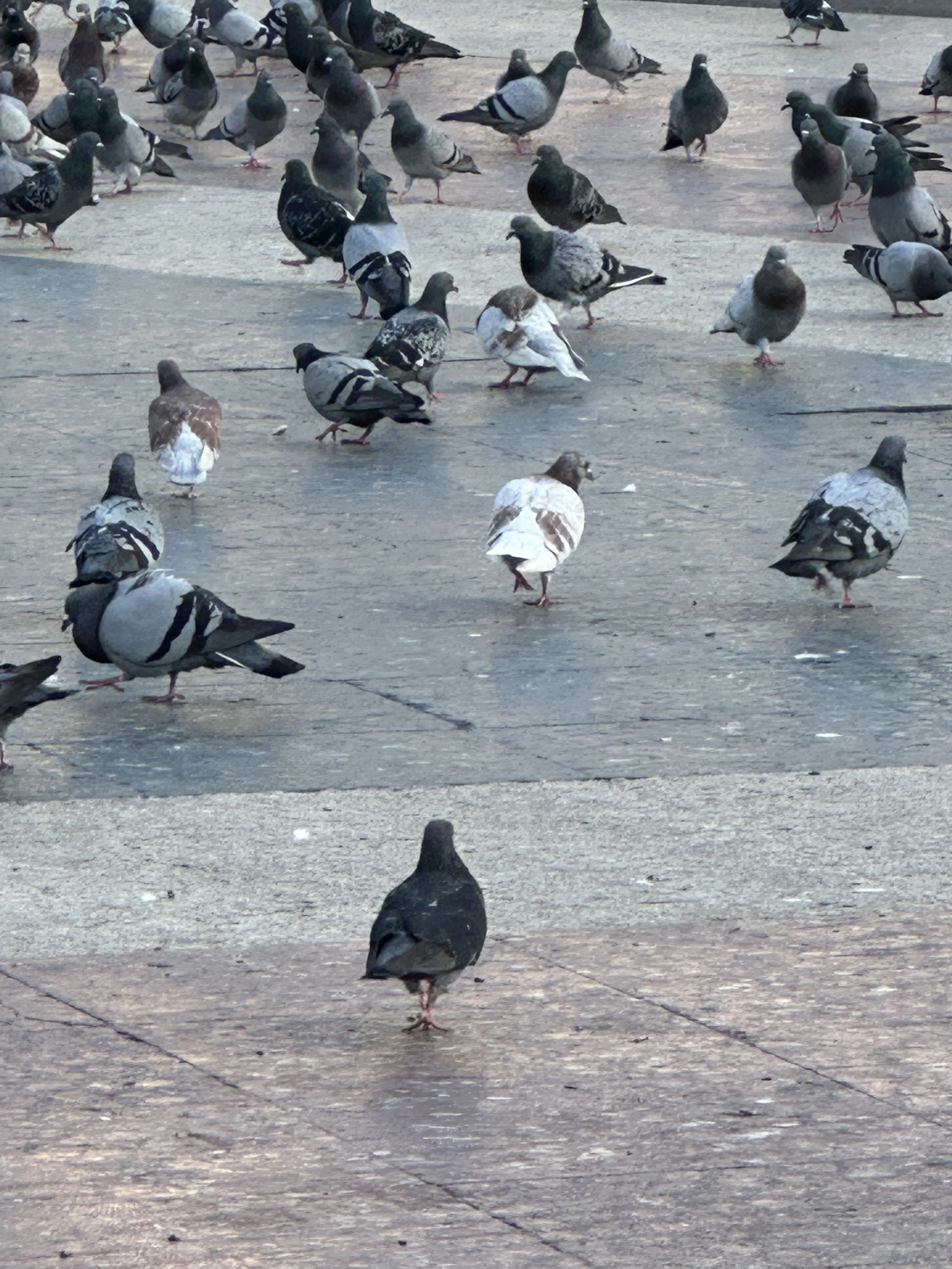 Knowing my luggage had been located, it was no longer necessary to shop for clothes. Just one more day in the same clothes haha! Walking back to our flat, we walked through the birds that appear every afternoon in Placa Catalunya. They are entertaining… hundreds of them pecking crumbs off the ground. Kids try to chase them down so they will flutter about, they always return right away.