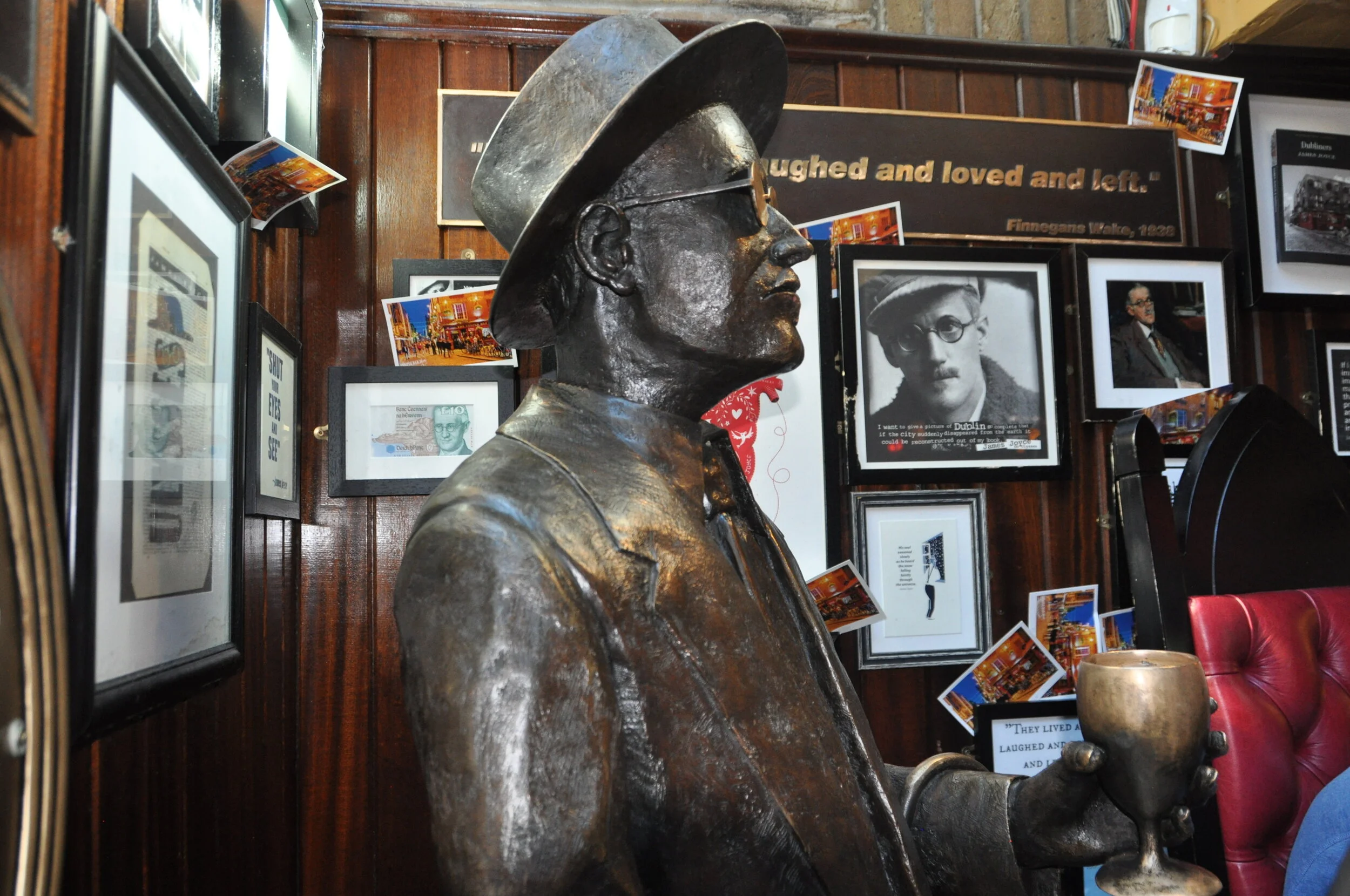 Dublin is full of statues...these two were inside the Temple Bar. I pulled up a stool next to Jame’s Joyce (R). The walls were full of quotes from the novelist, poet and short story writer. What a wild bar… and we visited in the early afternoon!