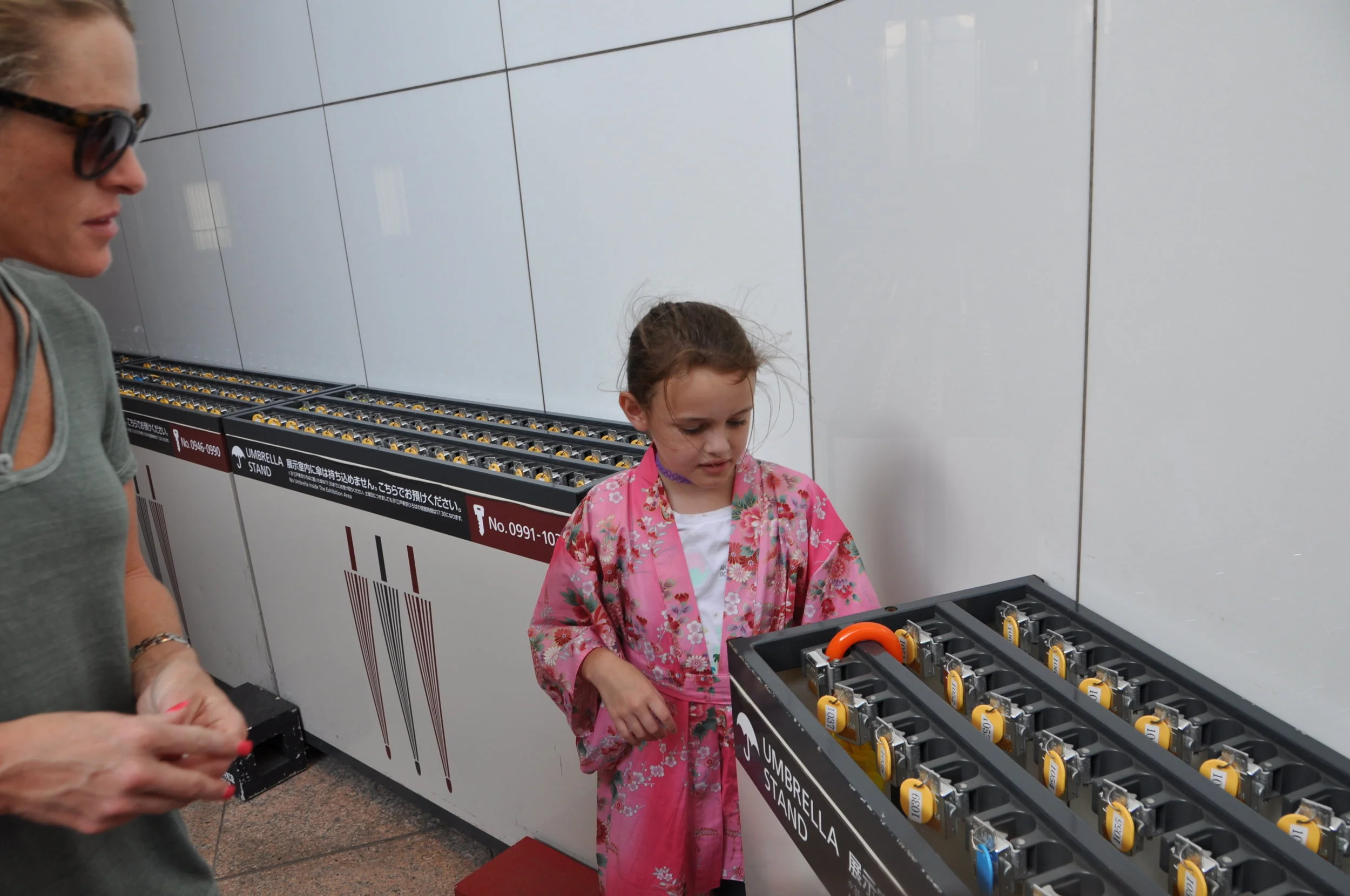 No umbrellas allowed in the museum! This was absolutely not a problem on this rainy day! Downstairs was a giant rack with a coin-operated lock system. The girls loved figuring out how to work it! All over Japan are creative solutions to making life simple :-)