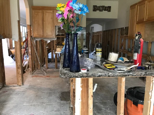 In an effort to make being around the house easier on my granddaughter, I had her pick out flowers to brighten up the place. Adding a little color gave her something happier to focus her attention. It's not easy seeing your home torn up this way. At this point, the cabinets were still up on top. We attempted to salvage them...