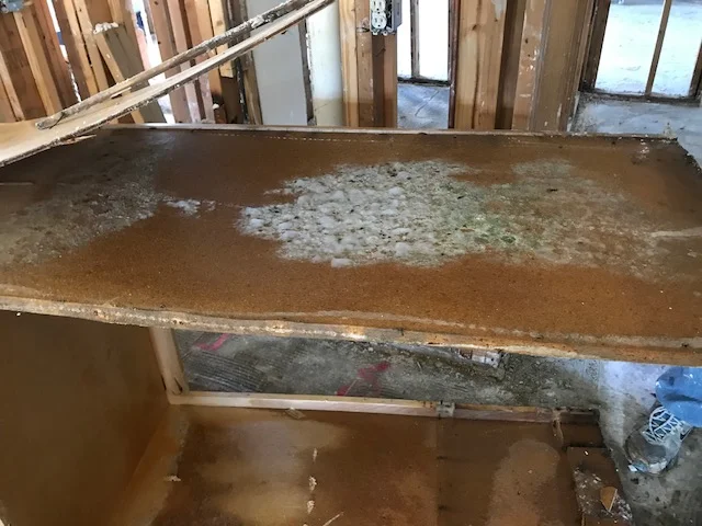 To be safe, we decided to take a peek behind the cabinet that held the oven/microwave. As you can see from this photo, mold began to grow quite quickly. This meant the remaining cabinets had to come down. It's not worth taking a chance. If left untreated, mold can spread to the upstairs of the house! So thankful we checked!