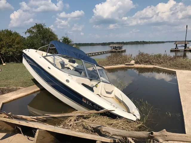 We soon found out why the helicopter was hovering. They found out a boat floated from somewhere and ended up in our across the street neighbor's pool! We went over to check it out and saw that it brought the ropes and part of the dock along with it.