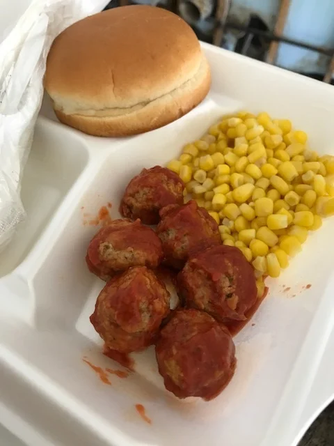 Finally the Red Cross came through with meals. By this time only our immediately family was working on the clean up of the house. We heard the megaphone announcing the meals but it was hard to understand what they were saying. I walked out to the front yard to see what was going but they passed by so quickly, I had to chase them down the street. They actually only came by, maybe four times. They raced through the streets so we actually only received two meals. We just couldn't catch them!