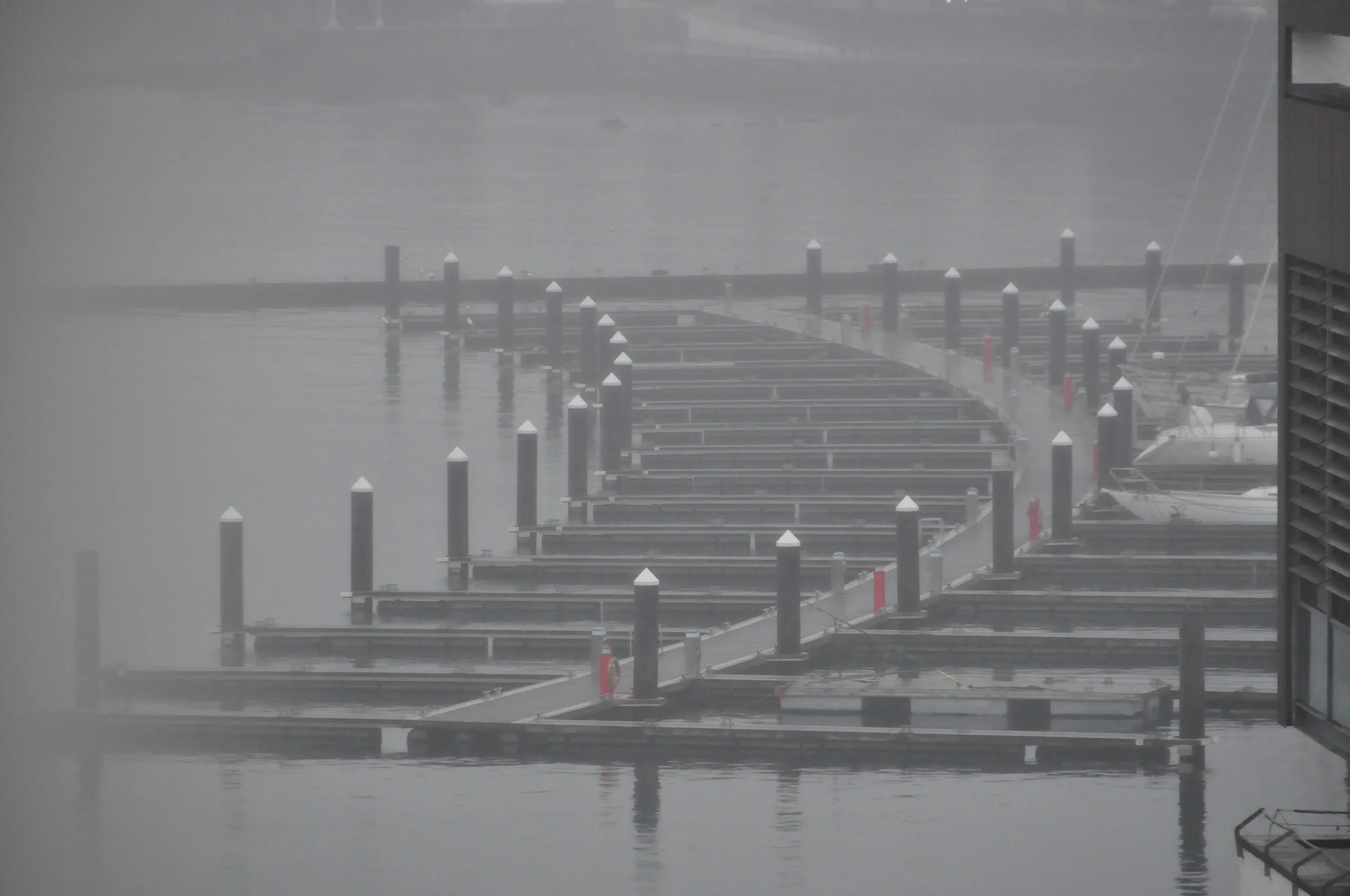 Interesting how much the weather changed the feel of this small island. We have visited five times in the past and assumed warmth, but after checking out the usual weather… I guess we’ve just been extremely lucky! The summer months are warm but spring and fall when we travel, are usually cool with a good amount of rain. First sight from the balcony was this boat harbor. A good number of slips were empty.