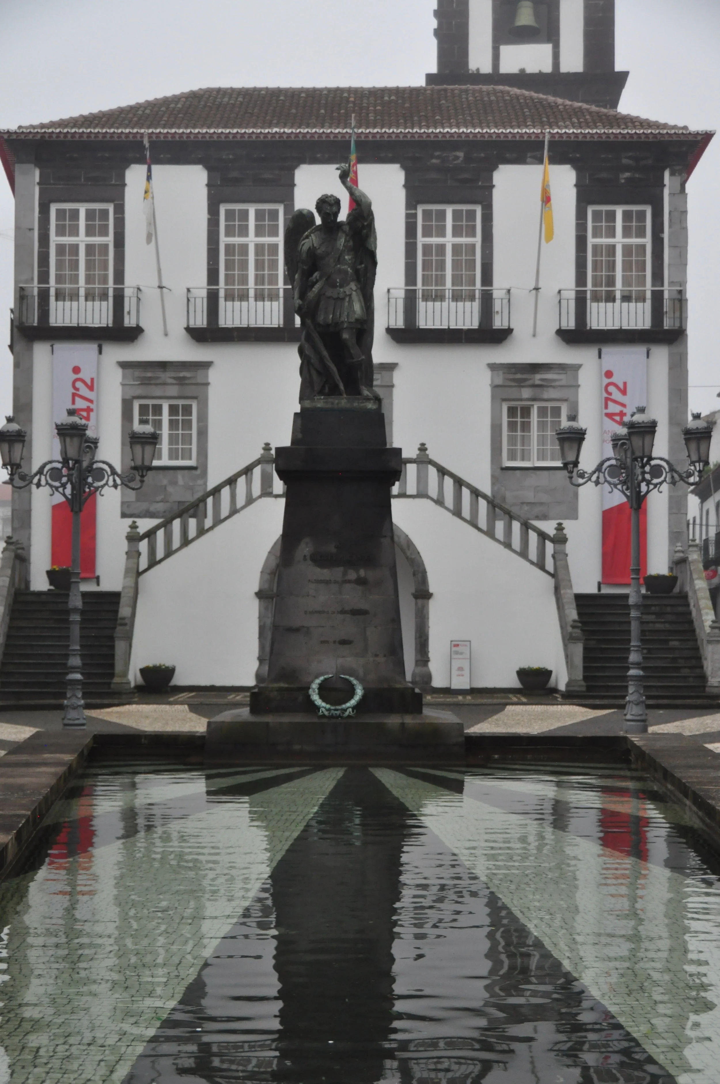 Sitting in front of Ponta Delgada City Hall, the archangel Michael is a beautiful bronze sculpture. This saint wears armor and is armed with a sword. The pool in front and the building in the back is a stunning setting.