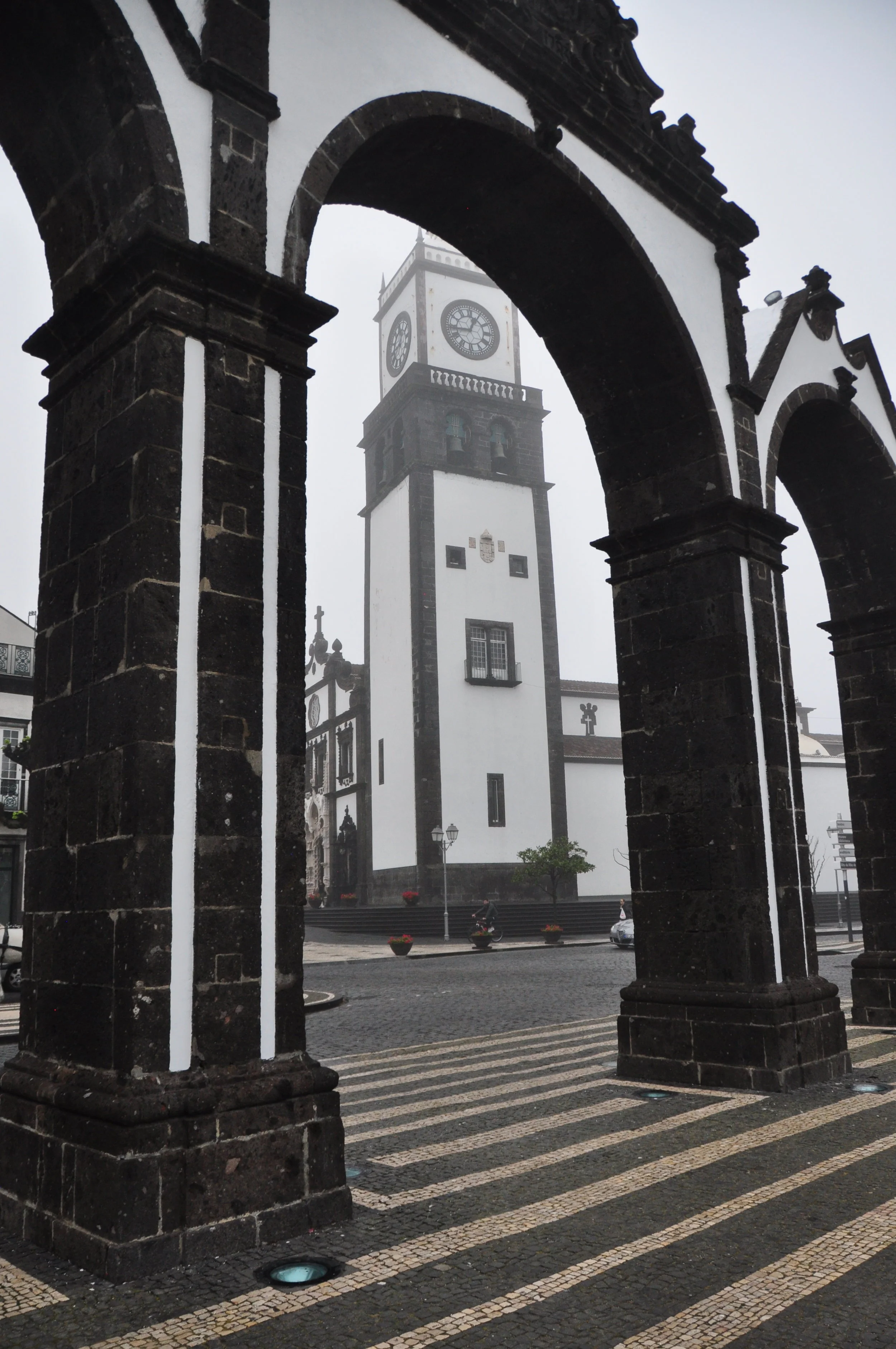 The city gates known as Portas da Cidade of Ponta Delgada is three arches made of local stone. I could have taken photos for hours through these arches. So many angles, different views through each. The church in the background… a flower stand… the port… Barry was ready to move on :-)