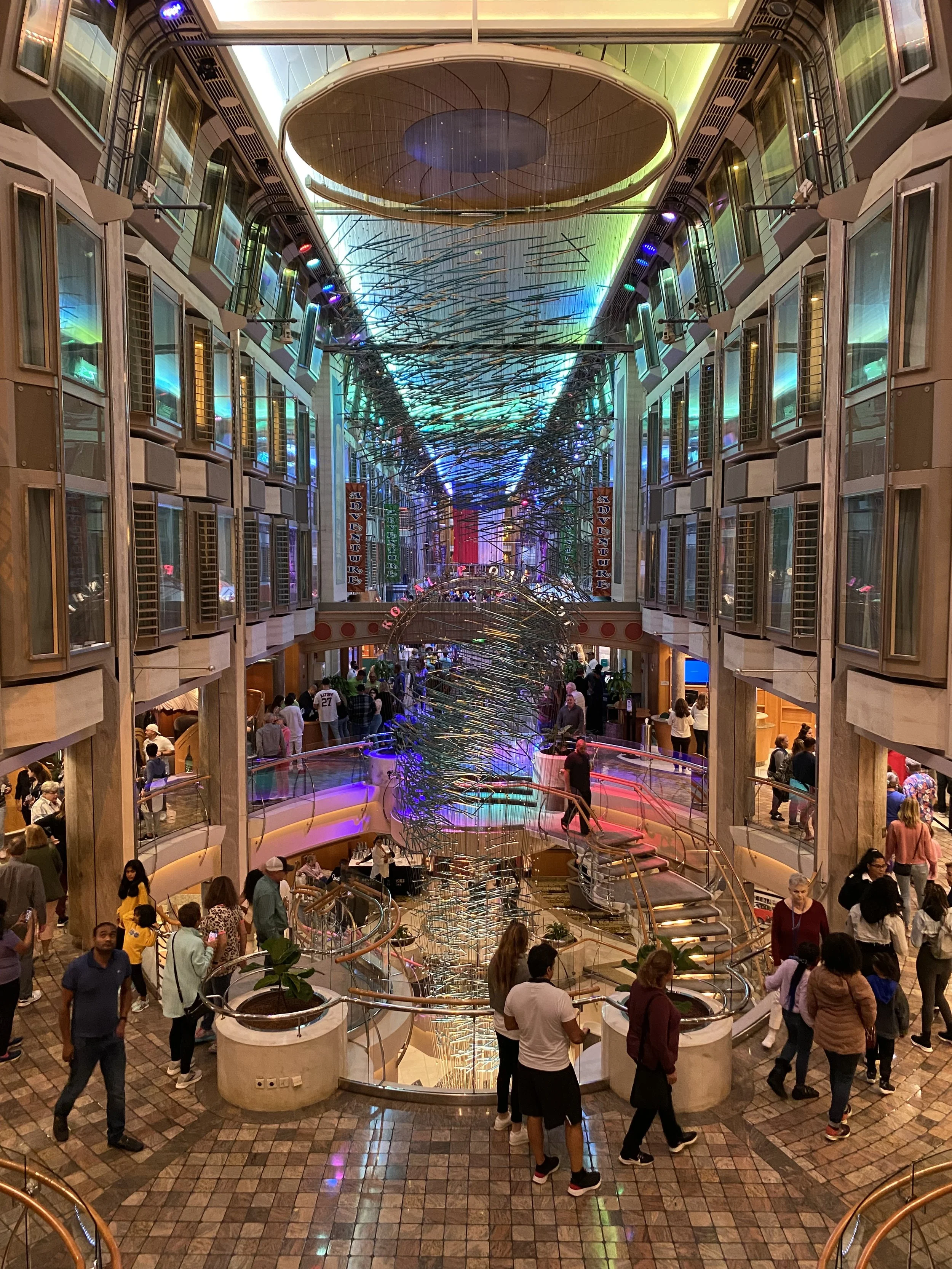 With every step, memories of past cruises flowed through my mind. Entering the promenade area, I pictured a ceiling of balloons from NYE past, Halloween costumes parading through… dance parties… so much fun in these areas of the ships!