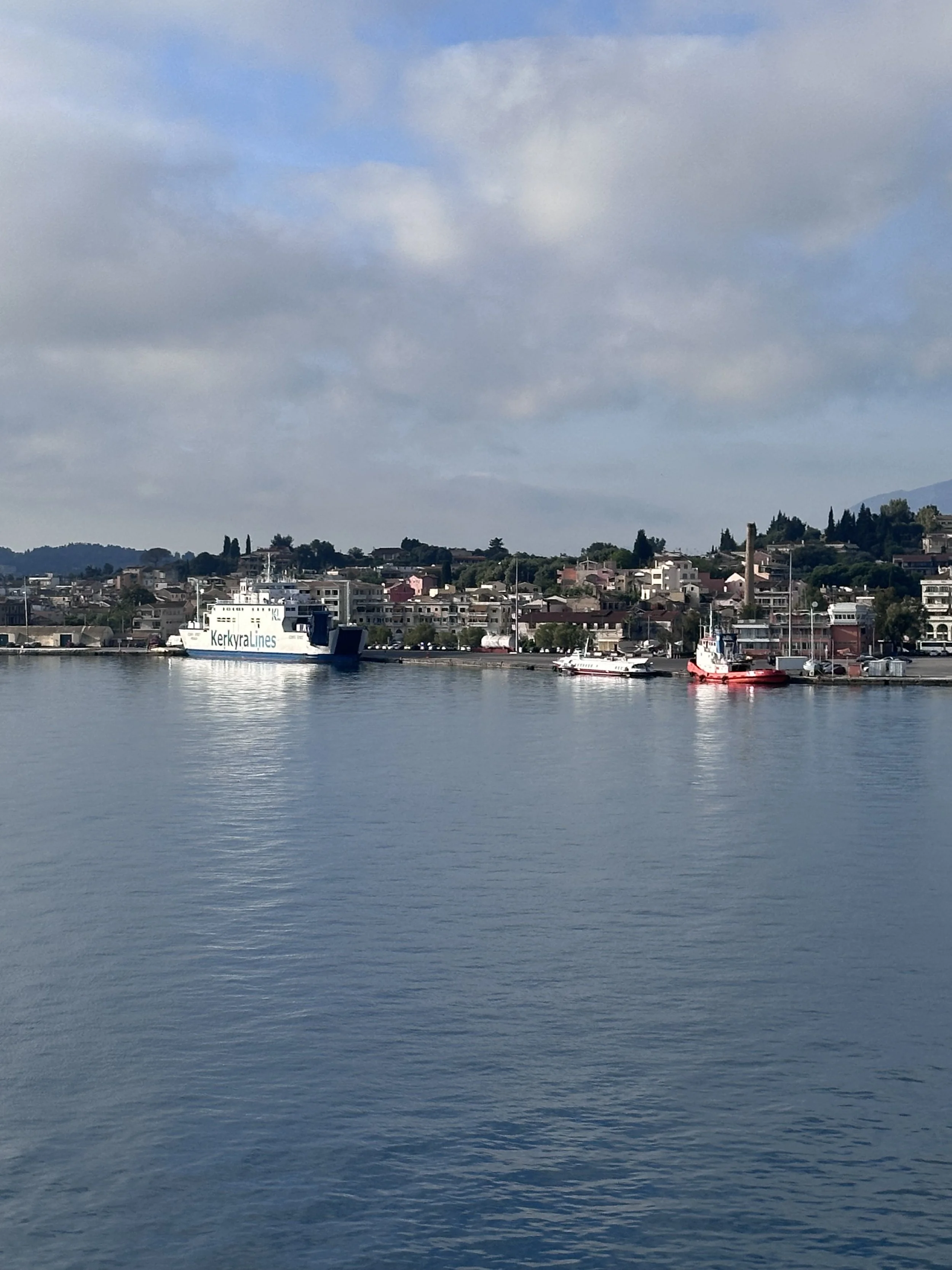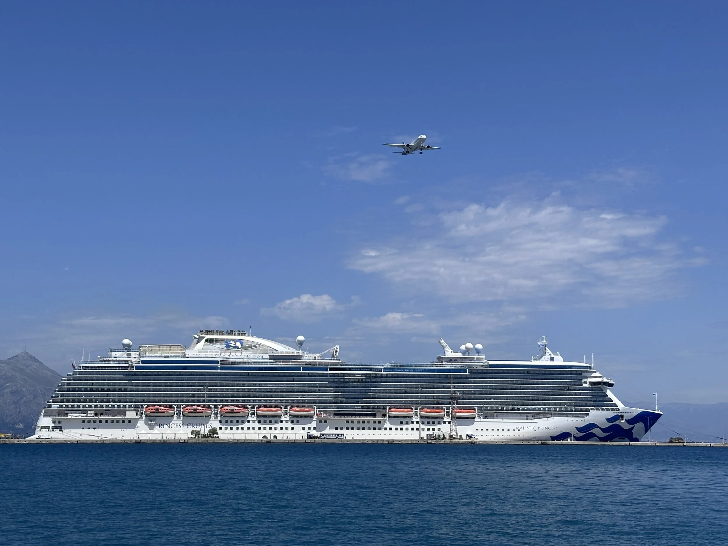 Once off the HoHo bus, we walked across the port parking area. It was a bit of a walk from the drop off spot to the cruise terminal. Being alongside the water made it enjoyable. Deciding to take a photo of our ship, it was perfectly time to capture another mode of transportation… an airplane of final approach into Corfu airport!