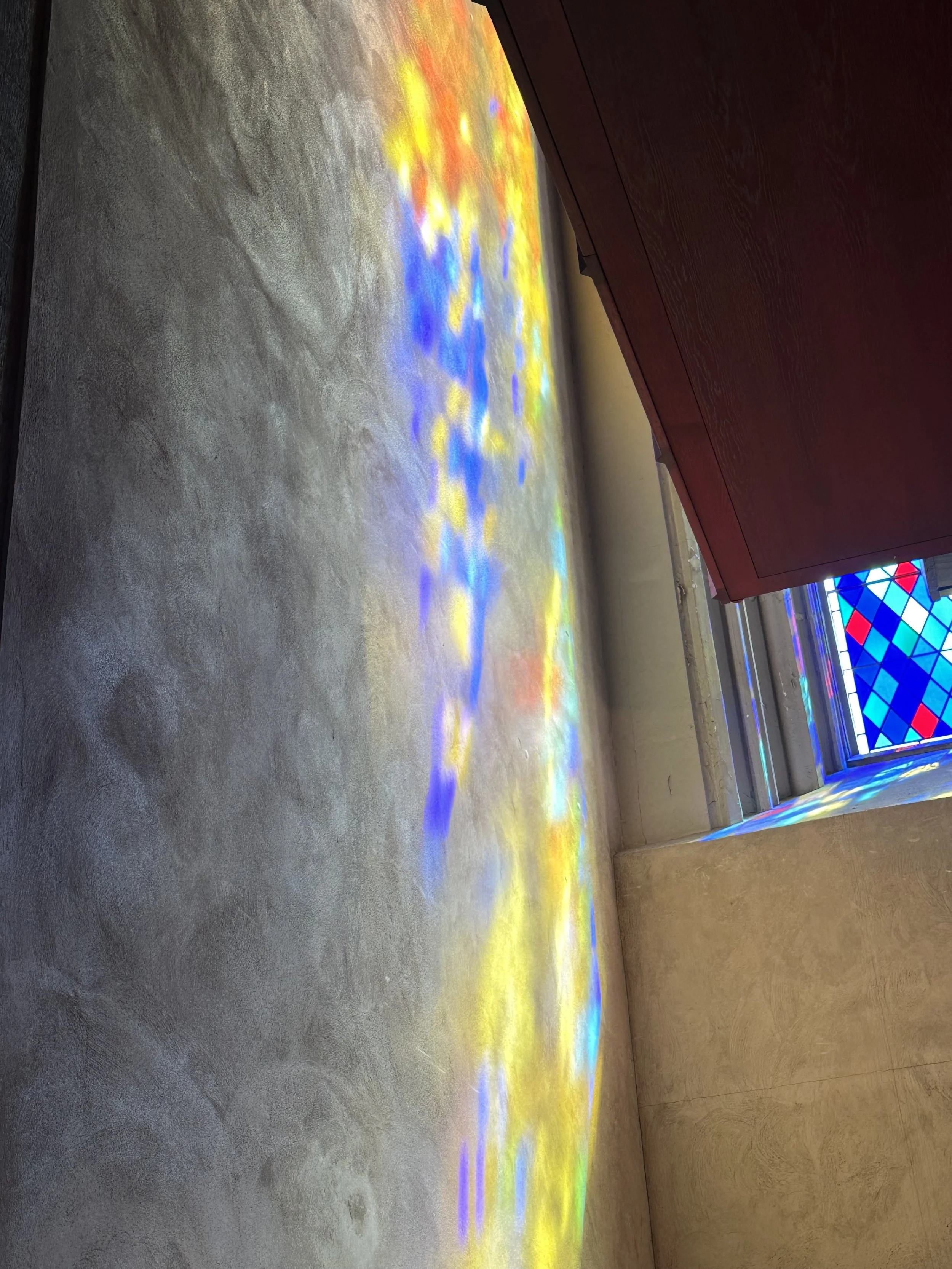 Learning about the intentional placement of stained glass from La Sagrada Familia in Barcelona, I paid particular attention to the reflections in St Glies. Thankfully. Visiting at the right time of day… colors splashed along the beige walls.