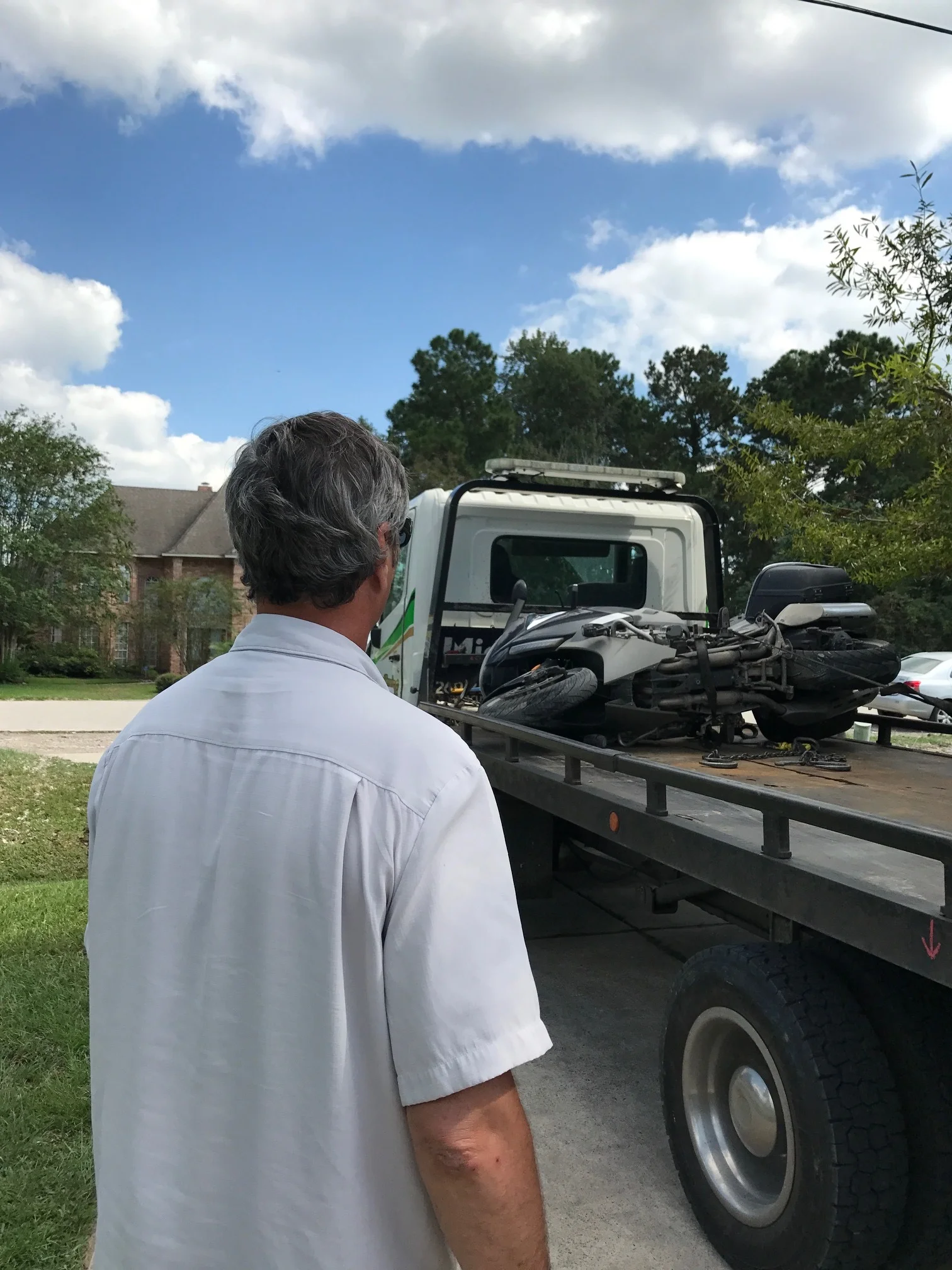 ... and then he said goodbye. It was emotional. Another thing gone. As long as it sat in the garage, it was like we still salvaged something. It hurt me to watch Barry looking at his bike leave on the back of a tow truck.