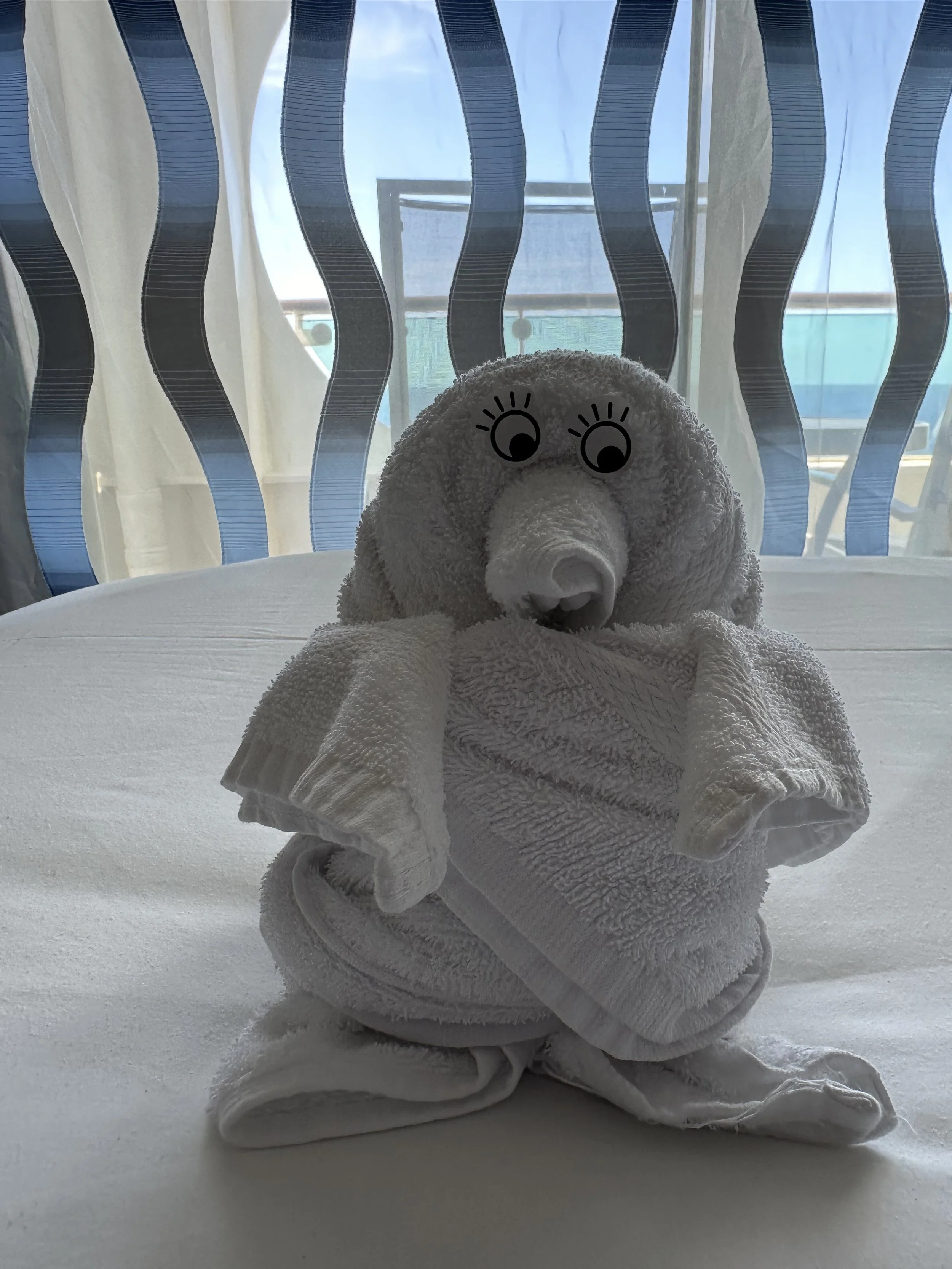 Not a fan of the duck phenomenon, it is extremely popular with a large number of cruisers. In the months leading up to departure, guests post photos of the ducks they have purchased and plan to pack. The idea is to hide them all over the ship. For some reason, people get excited when they find one… it is the finder’s choice to keep the duck or hide it in a new location. During my “first view”, I noticed this duck had been tossed onto our balcony. Ugh… Probably our neighbors tossed it around the privacy wall. Now, I have to decide what to do with it!