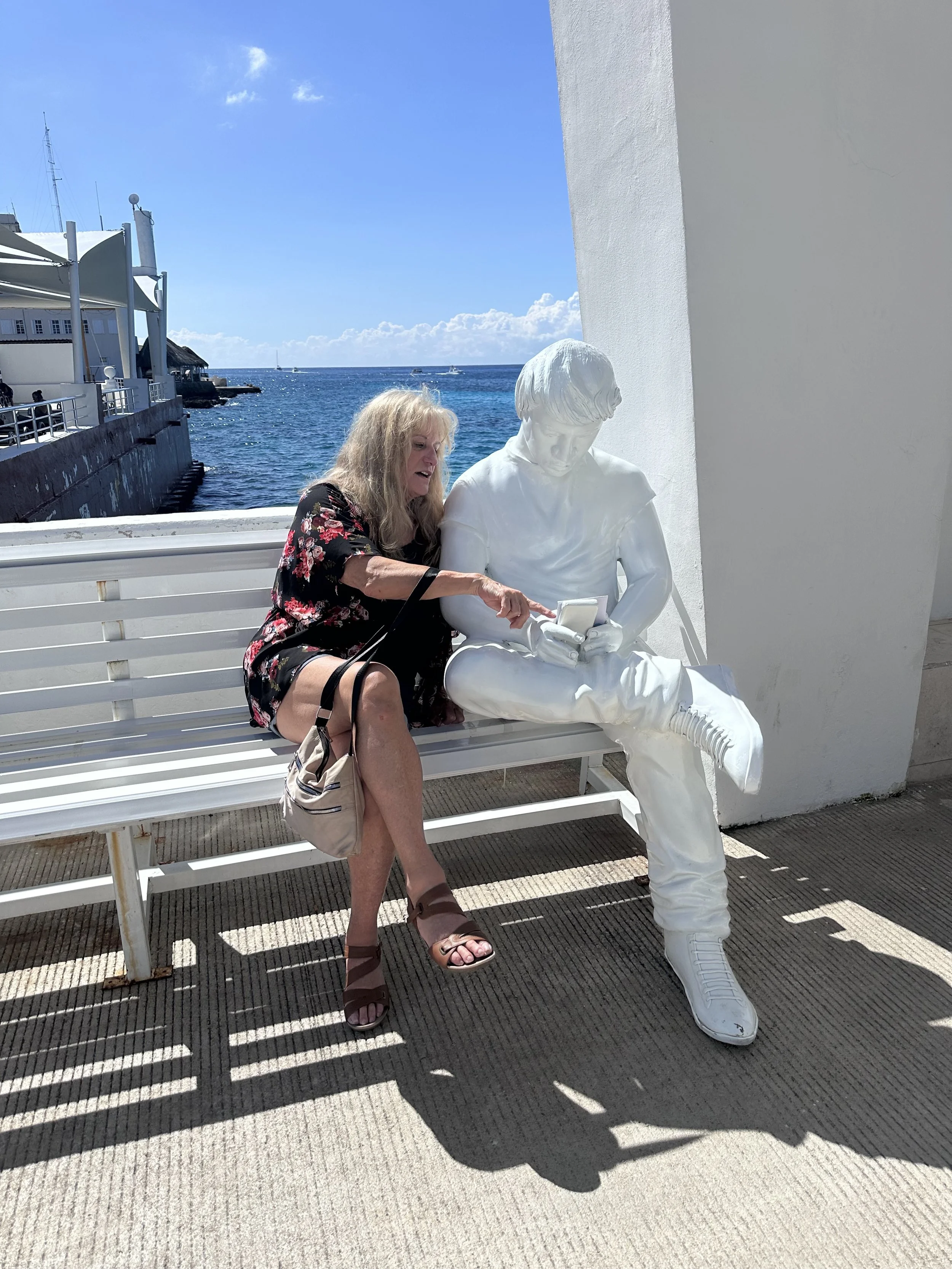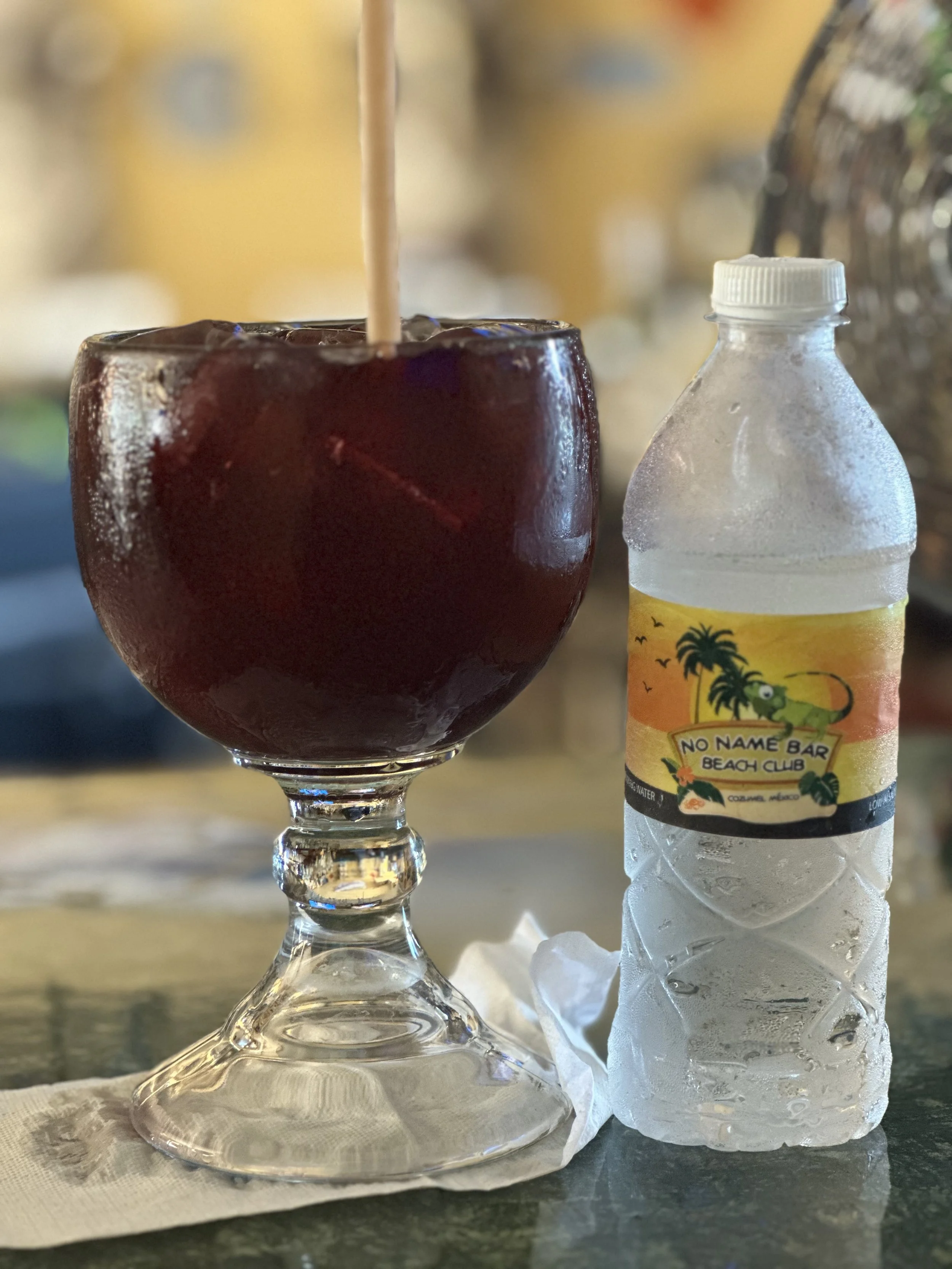 Arriving in Cozumel, I usually don’t step off the ship. Having visited so many times, I usually enjoy the empty ship. This time, we had errands to run so off we went. If I’m heading to shore, a quick stop at the No Name Bar is a must. Dark and divey, this hole in the wall is a great place to spend a port day. If you click on the photo and zoom in on the right-hand photo, you will see the umbrellas and a bit of the pool. When visiting this bar, you can enjoy your drinks/lunch in the bar or out by the pool for no extra charge. We chose to hang out with the bartender… tacos and sangria!