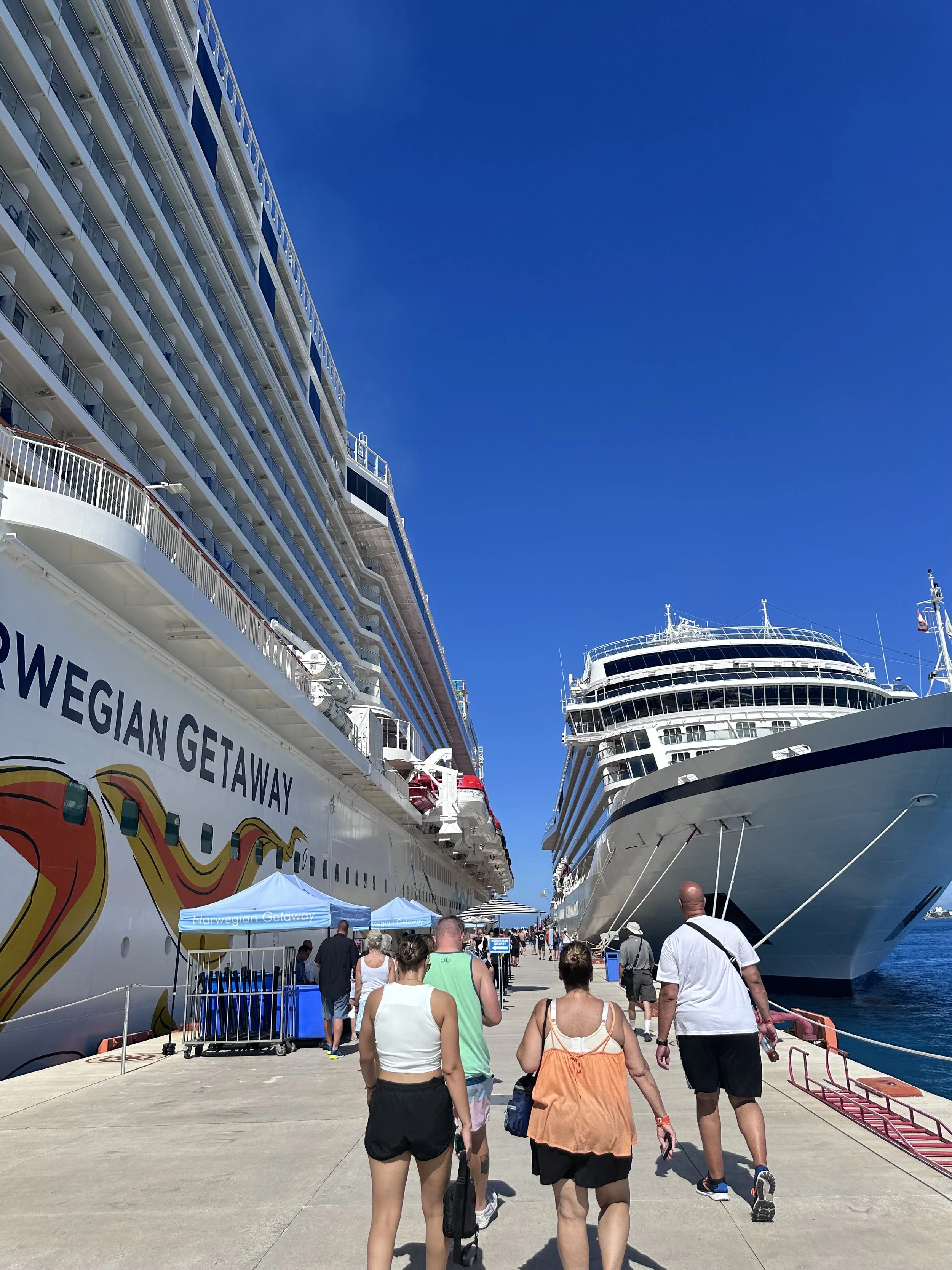 From the shore, our ship sits in beautiful blue waters. This area has quite a bit of boat traffic (tours, etc) but the color of the water is so inviting! There are nearby beaches. This time we were docked at such a convenient location.