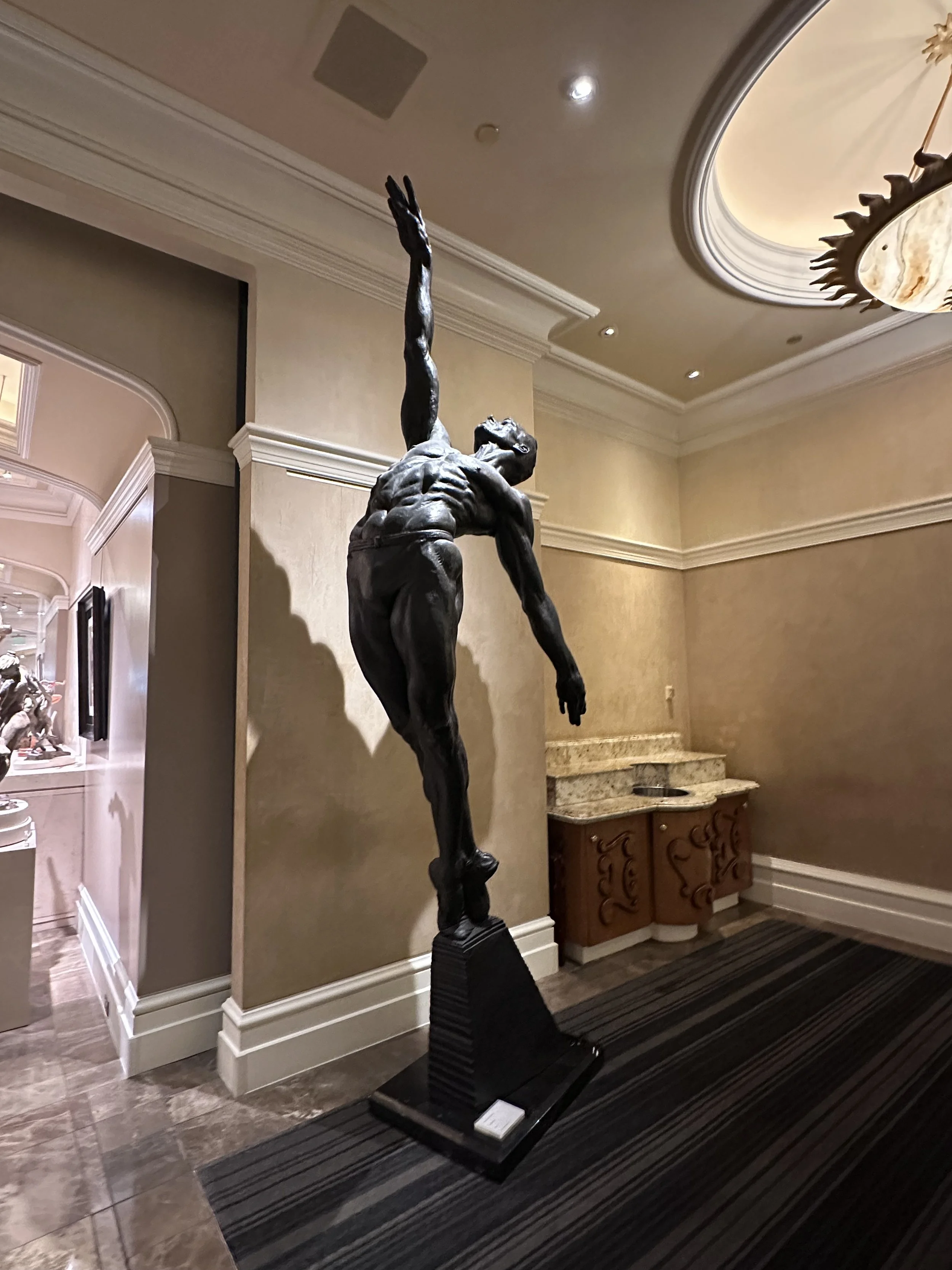 Interesting only to me… this Richard MacDonald sculpture displayed in the lobby outside the showroom had special significance. First, years ago, I worked for an art gallery on Kauai that featured the works of Richard MacDonald. This talented sculptor created Cirque du Soleil “O” to capture the idea of the fine line where athletes defy gravity. All of his sculptures involve the movement of dancers, acrobats and gymnasts. He died of cancer in the early 90’s and his artwork has become quite valuable. Not knowing this about him, I was surprised to see so many of his works on display…