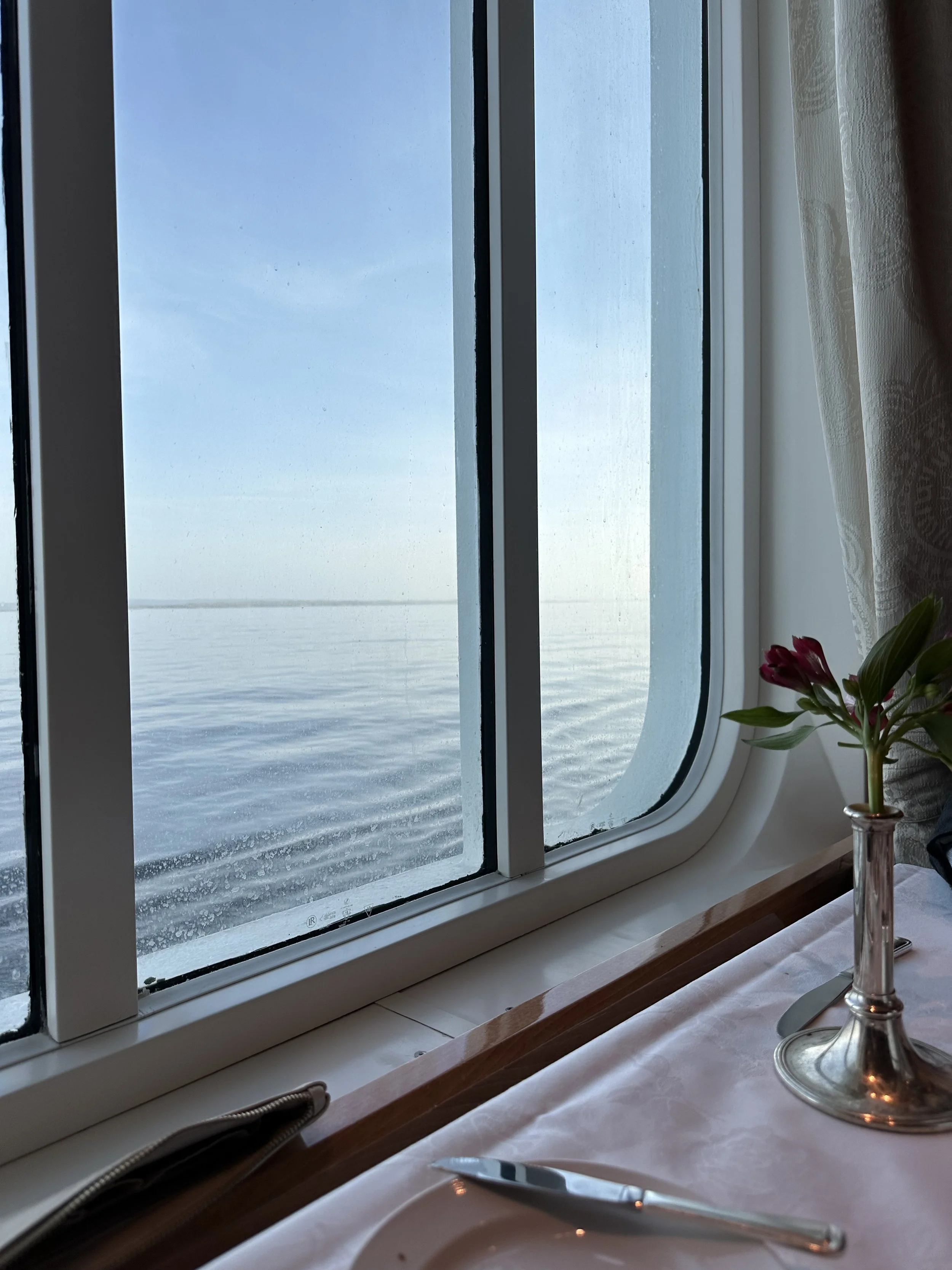 Not only did we switch things up by making a port day a sea day… but we took a night off from Specialty Dining rooms. This is our first time trying the Main Dining Room. To be honest, we were hesitant because of so many complaining people but we didn’t want to leave without trying it once! Arriving around 7:30, we were promptly seated in a window seat for two. That was a nice surprise! It’s not that I don’t like the MDR, it’s just that sometimes, it’s a bit chaotic. We were on the edge of the room so we missed a majority of the hustling. The service was perfect. Gluten-free bread was served with warm butter and the waiter let me know which items could be adapted for G/F and nightshade free. My choice was an interesting dish… it was a bowl of rice with a delicious spinach green curry. It really hit the spot! Our servers were disappointed we didn’t have dessert but we’ve tried to cut those out for the most part!