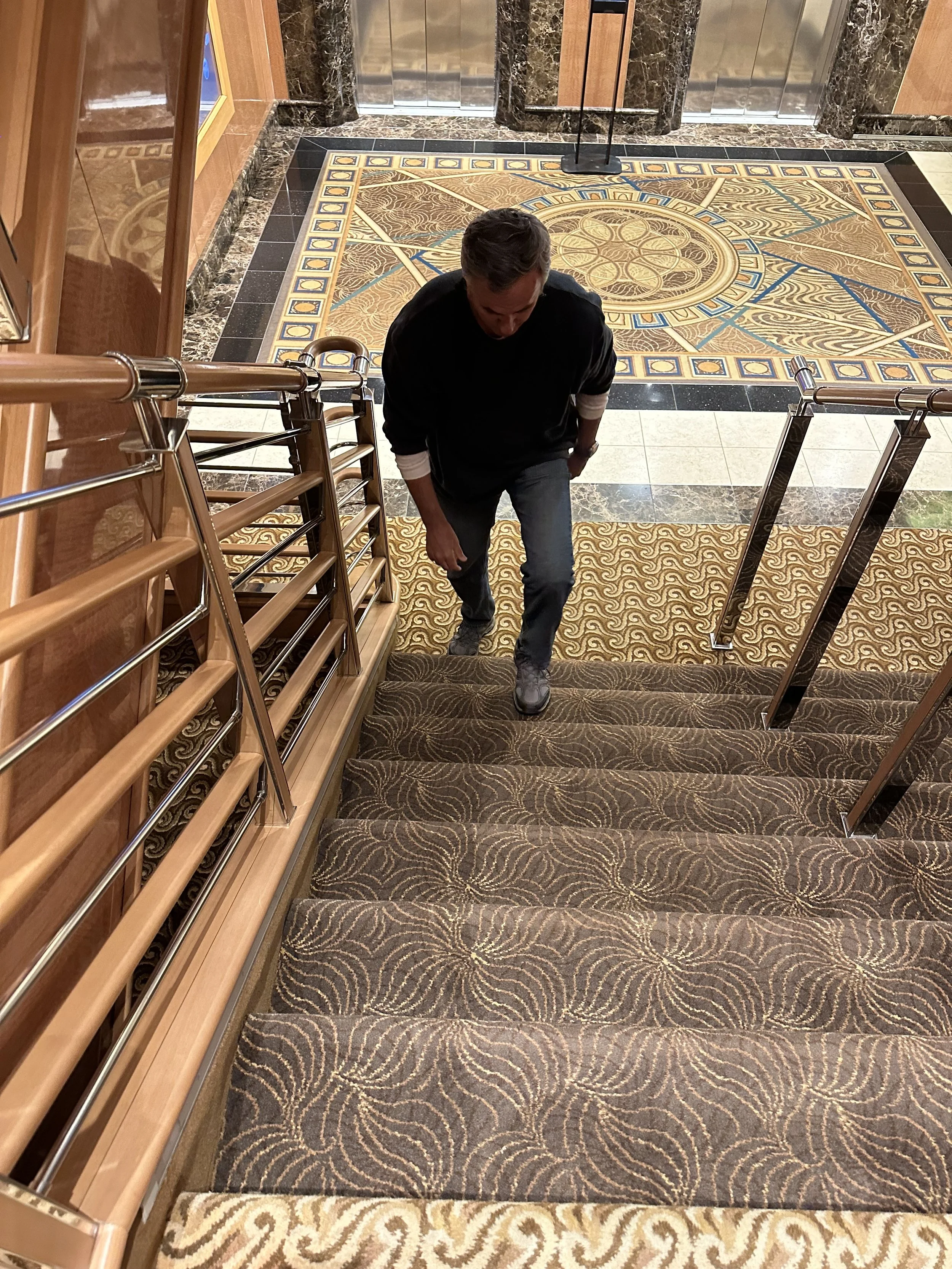 Here’s proof we tried to take the stairs as much as possible. Often there are people in scooters who have a heck of a time getting on the elevator. Perfectly healthy guests will take the elevator up or down a single level rather than take the stairs. We always walk down and try to walk up as much as possible. With my foot still in recovery mode, it wasn’t as often as usual. Anyway, our ship ported off the coast of Greenock, which is the closest port to Glasgow. Before we went to bed last night, we decided to make this a sea day. We really aren’t used to such port intensive itineraries… but I better get practiced because next year’s Asian cruise will be 13 days action. Although, it will actually be about what we have made this one.