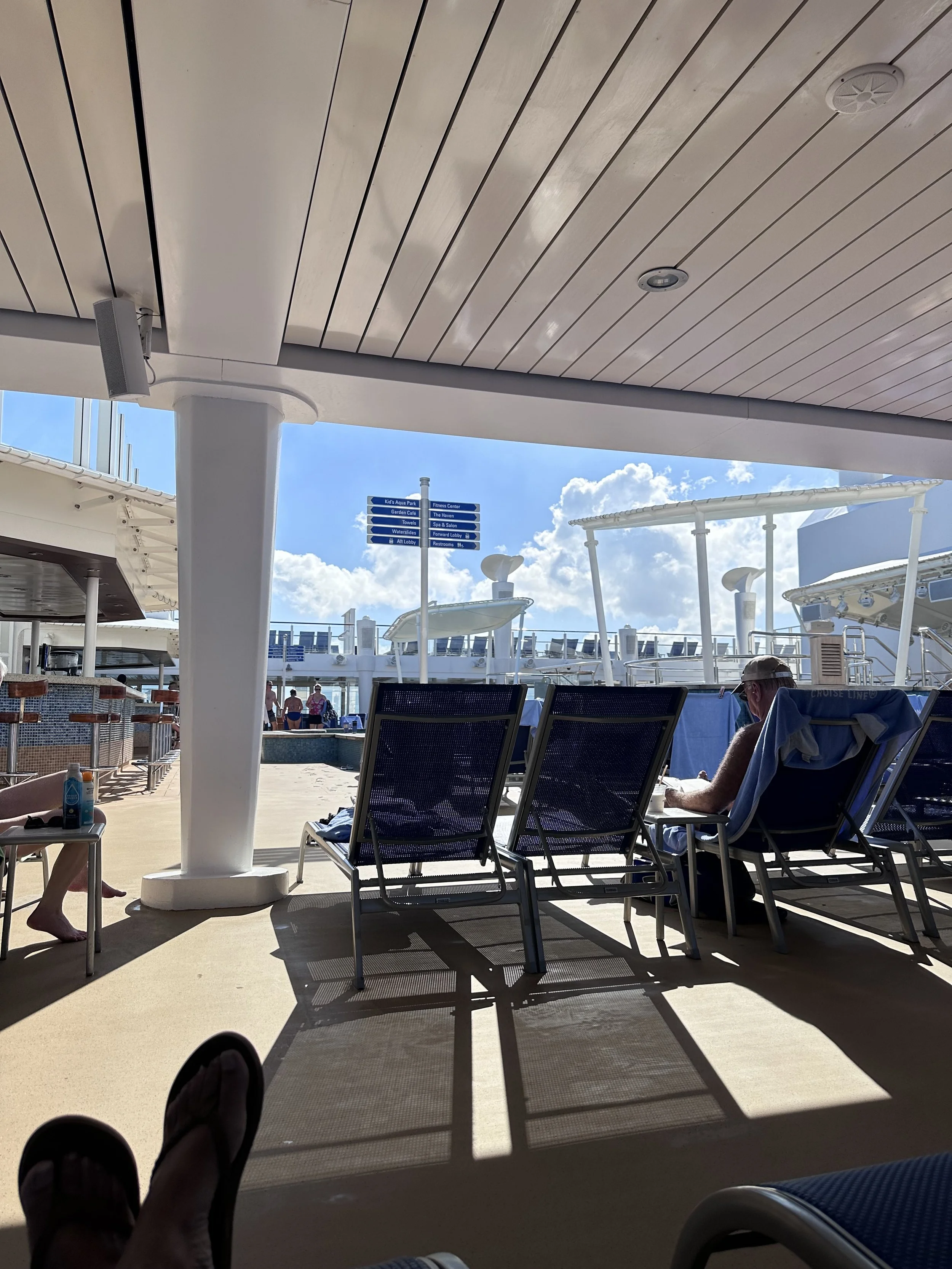 After a solid night sleep, rocking to the gentle waves… we spent a little time on deck. One thing I’ve always liked about Norwegian is the outdoor areas. Deck 8 is lined with pods of wicker furniture. As a family, we’ve spent hours upon hours hanging out in these social gathering locations to play games. Very relaxing and a sense of being away from the crowds. With a couple of nearby outdoor bars, service is provided. Such a great spot to watch the ocean…