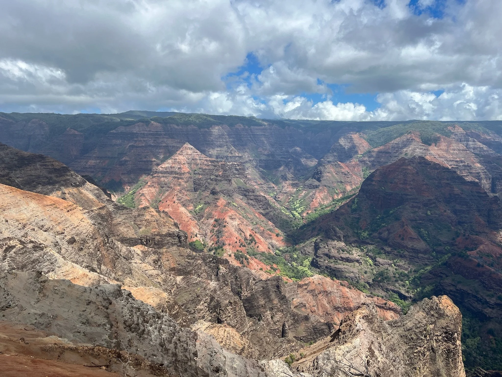 From this vantage point, it appeared it would be a stellar day. Waimea Canyon are can be hit or miss with weather. The clouds like to hover over the mountain peaks. Not on this day, so far the clouds stayed up high.