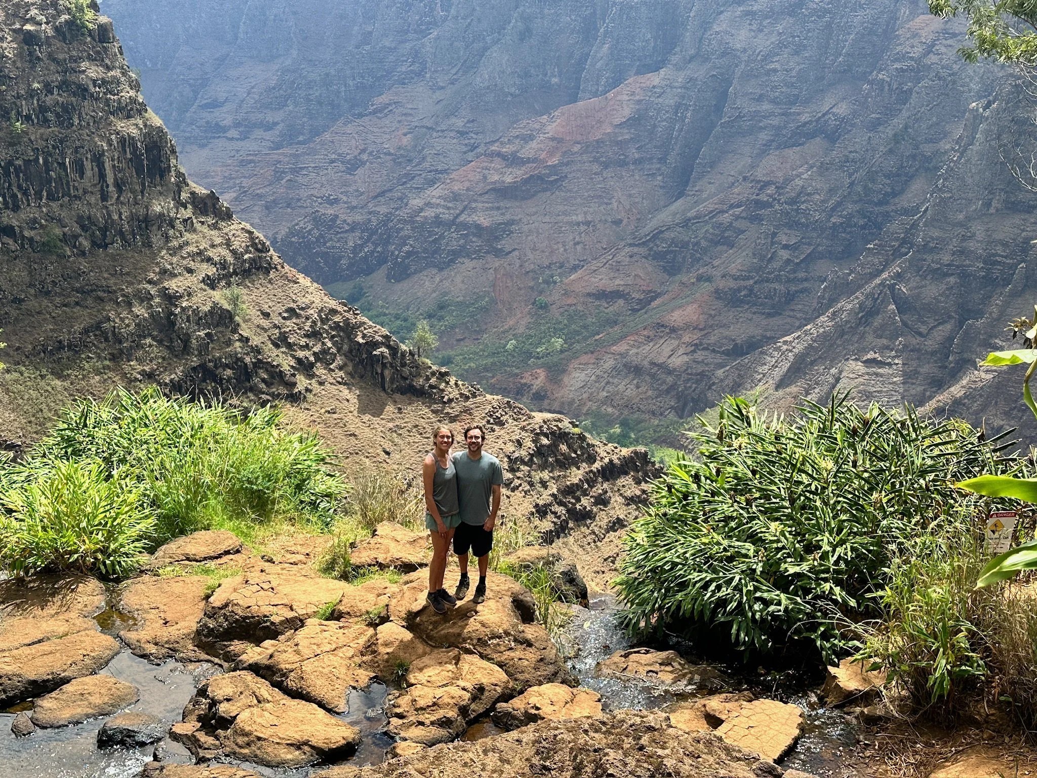 The enniversary couple posed with the canyon in the background. Unfortunately, the Kalalau Valley was socked in with clouds so the group was unable to see the lush green valley and the shoreline/ocean below.