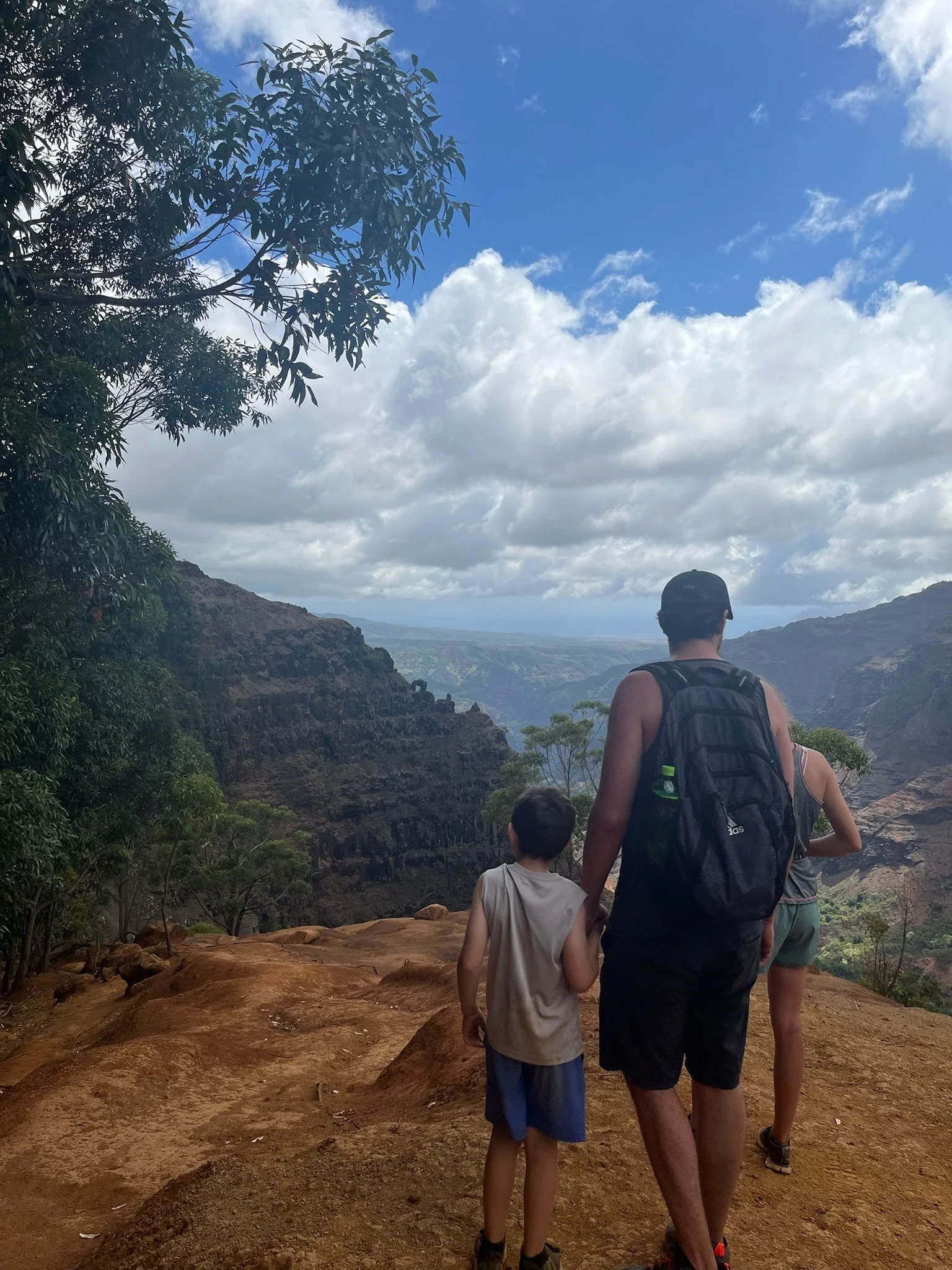 Here we find the perfect spot for a photo! Ezra clowning, Spammie being a good big sister! On the right, Dad jumped in the photo. Making memories is what vacation is about. One thing about Kauai is that there it has such a variety of landscape… desert beach areas with cactus, pine trees in the mountains, cliffs, thick, lush tropical and the “Grand Canyon”.