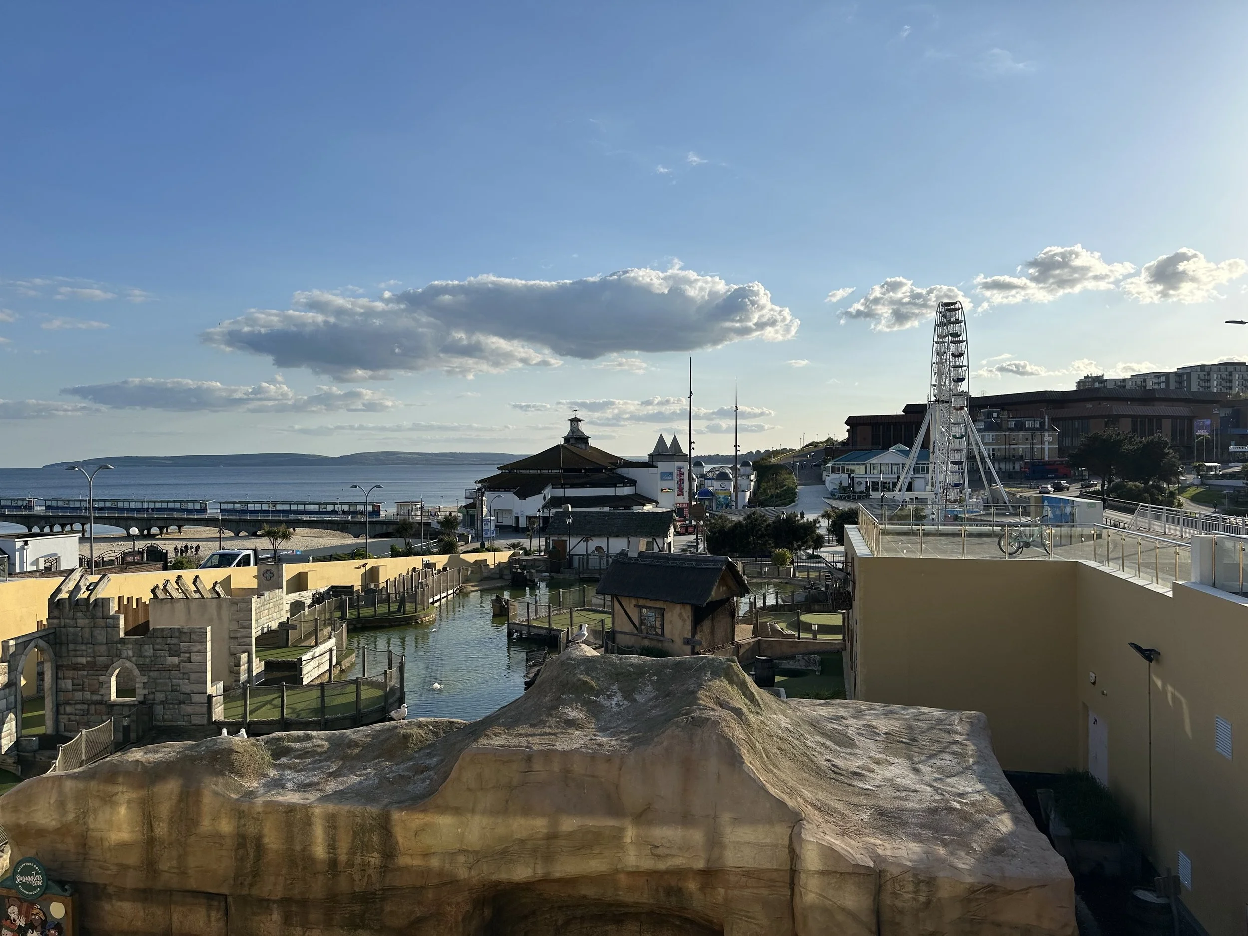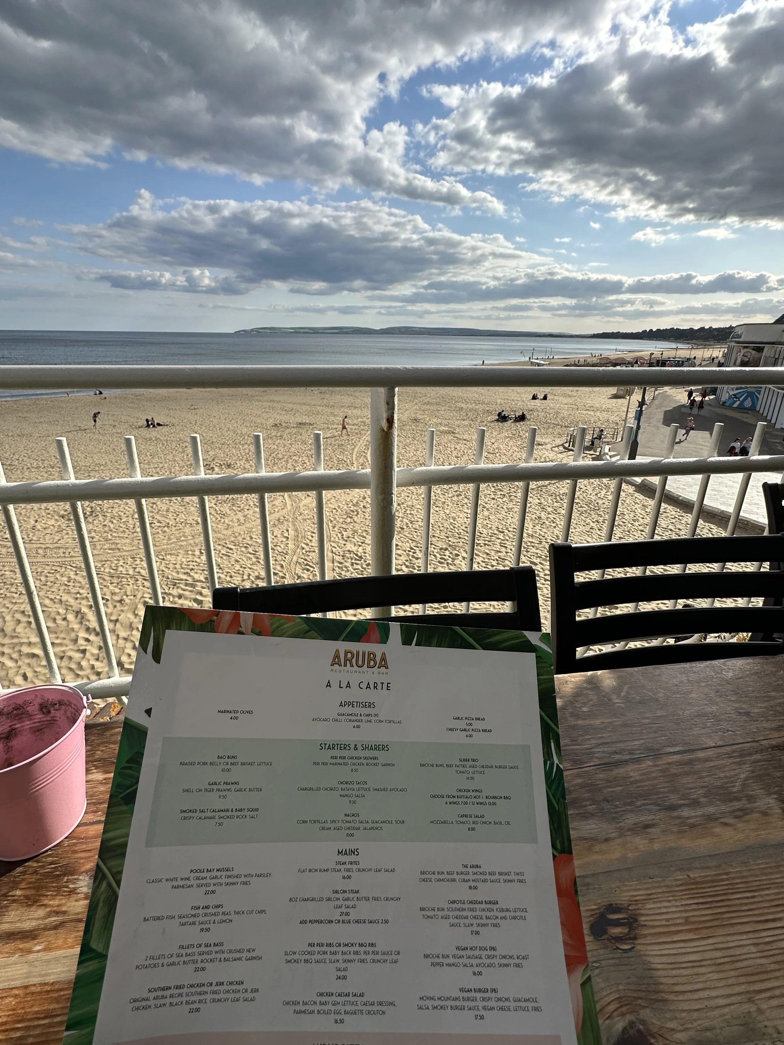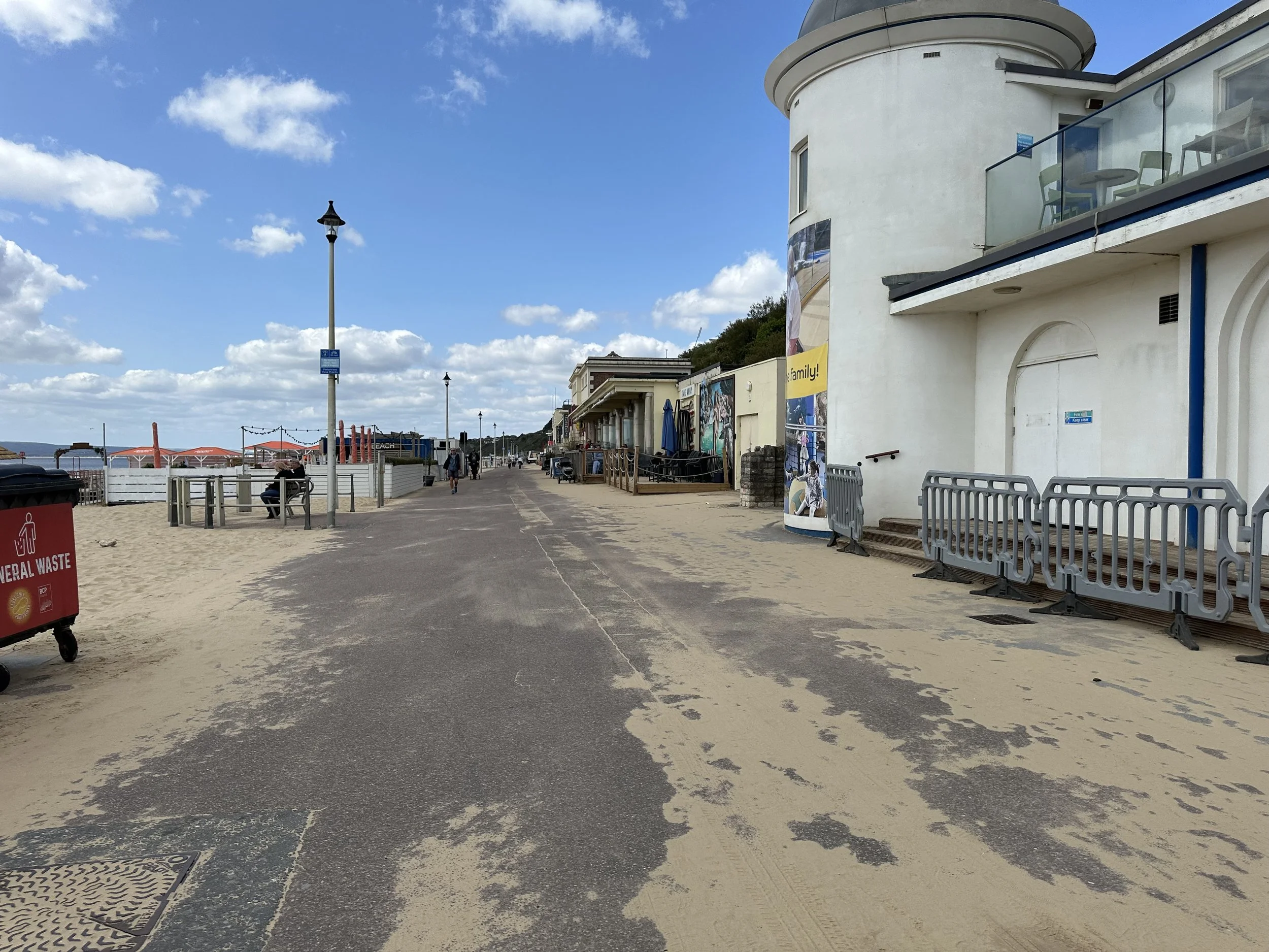 Down this pathway, we found a little shop. Always in search for ornaments, my hope was to find one inside. Success! I got a thick balsa type wooden “post card” with Bournemouth on it. It had a hanger for the tree… it’s mine now! We also got a couple of Dr Pepper’s to drink while relaxing by the sea… As we sipped our sodas, a couple of men came by talking. They clearly had something to do with the shops or the boardwalk. The sand on the walkway seemed normal to us… it’s the beach… but these men were not happy at all! They complained that workers were sitting in the cafe waiting for something rather than working to clean the area. Brushing their foot in the sand, they noticed it was slightly damp underneath which disturbed them even more!