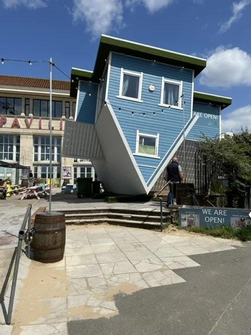 Not surprisingly, this upside-down house caught my eye. My first thought was being reminded of the Cube House we stayed in while visiting Rotterdam. It gave the appearance of a house tipped sideways. This one was actually an attraction. At a cost of 6.95 pounds, the house is built upside down so it looks like the visitor is standing on the ceiling and touching furniture. Pretty cute. There is a warning out front that those who suffer from motion sickness might have trouble.