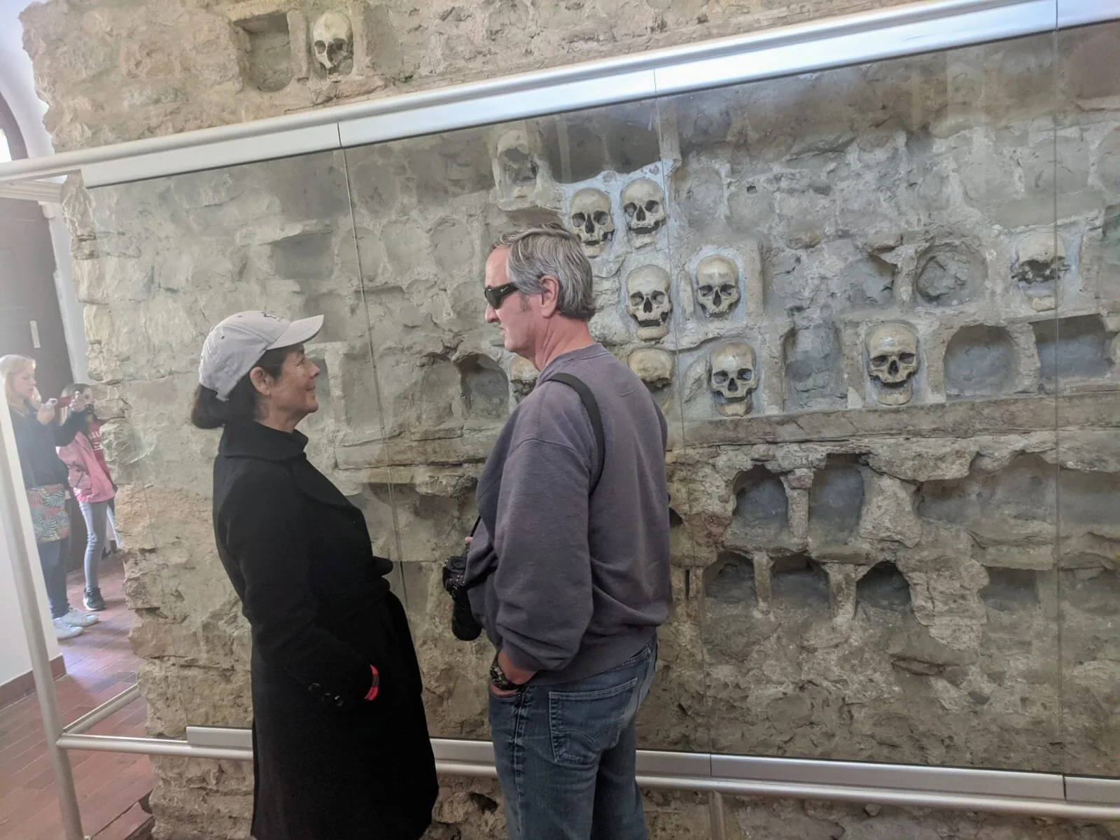 Obviously in deep discussion about the wall before us. Originally, 952 skulls placed in rows of fourteen graced the wall. As of last count, 58 skulls remain.