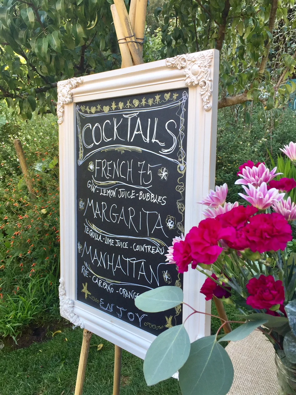 Sunday morning, we jumped in the car and headed for Marin County. My longtime friend from Kauai was getting married minutes from where Barry grew up. We got to stay with his sister. Fun to visit before heading off to the wedding. The first thing I noticed when we arrived was this cute idea for the cocktail menu. I stuck to the wine but should have tried something else.