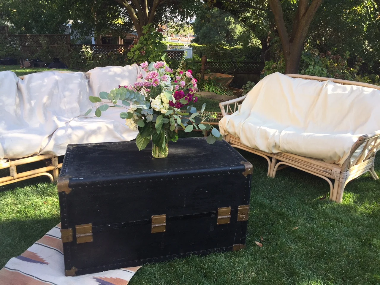 Situated in the backyard of a beautiful San Rafael estate, this cozy setting was one of several seating areas. Gorgeous day! Through there were fires relatively nearby, the winds had mercy and kept the smoke away.