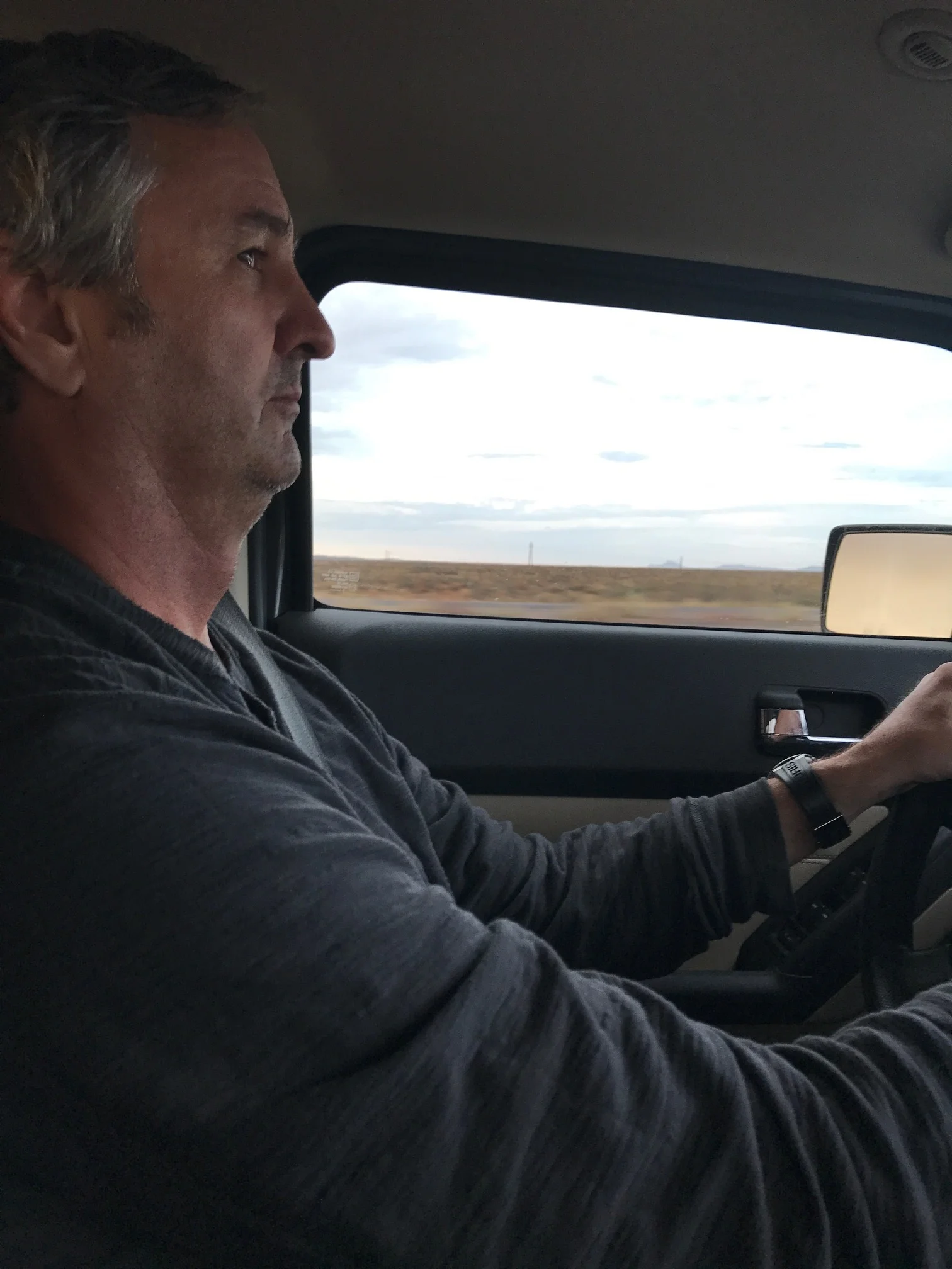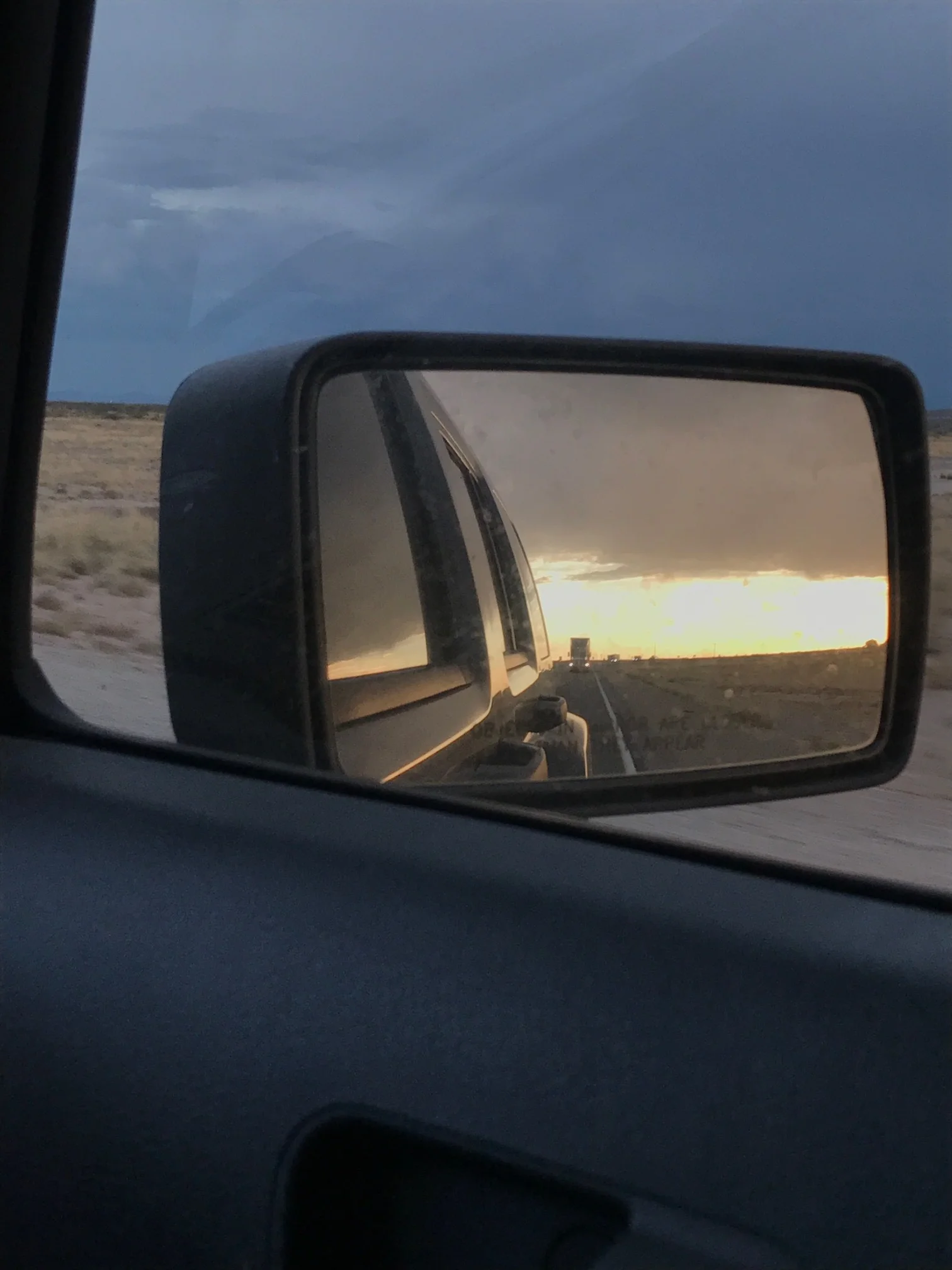 Trying to catch the setting sun in the rear view mirror. I can see where we're going and see where we've been. It's hard realizing we are heading back to the mess left by Harvey!