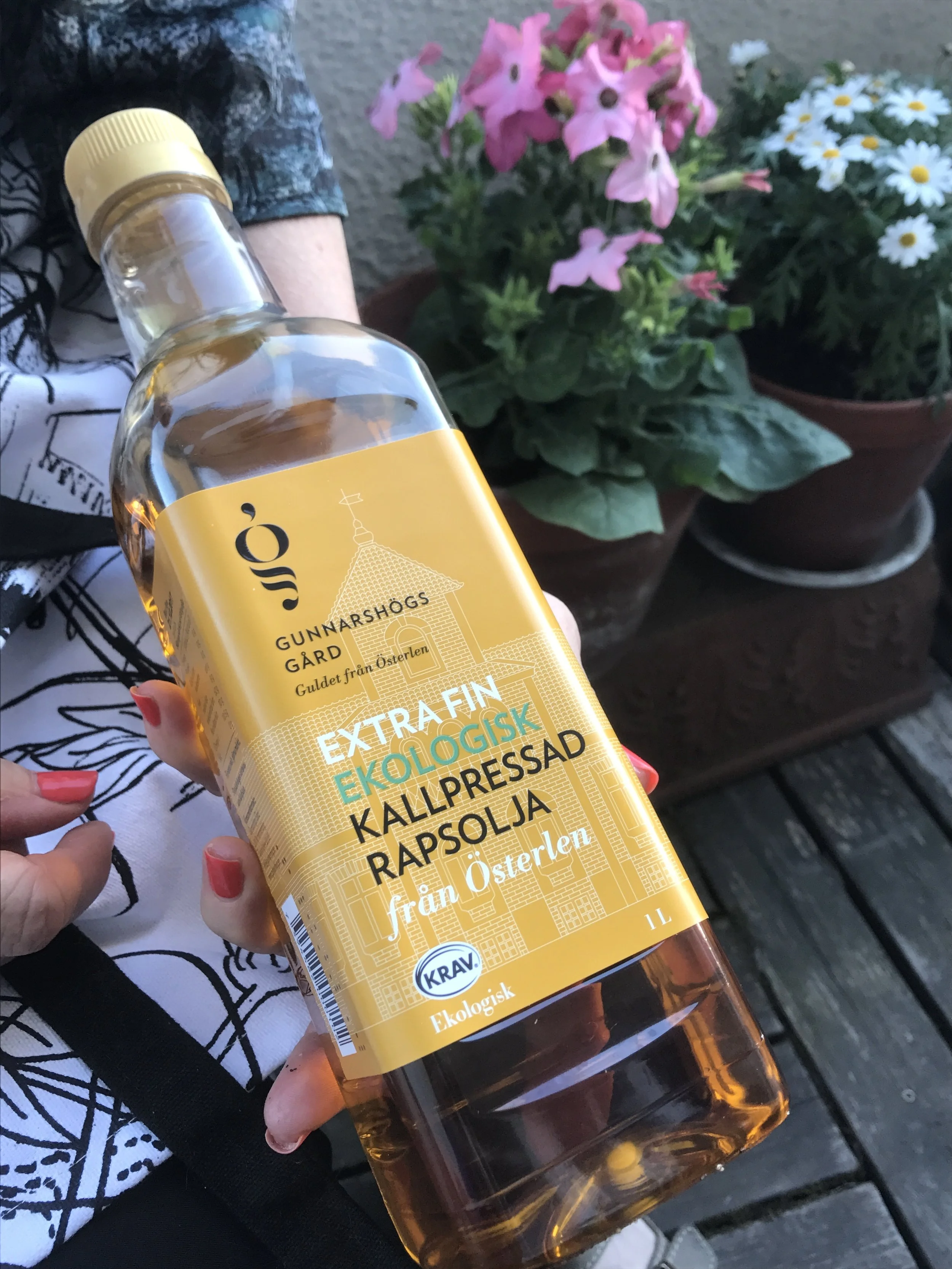 Mona showed me this bottle of Rapsolja. It is made from the yellow flowers that we saw all along the train route. It is a Swedish vegetable oil.