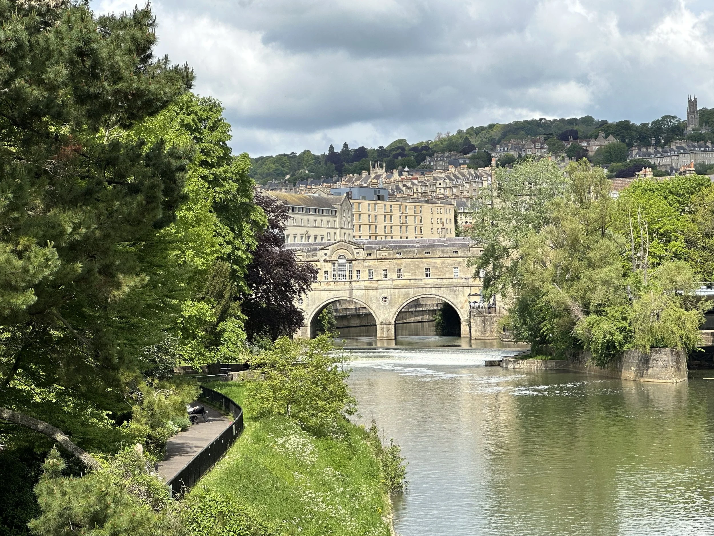 Built in 1774, the Pulteney Bridge connected the city of Bath with the Pulteney family land. Unusual in that it has shops built the length of it, on both sides. Crossing the River Avon, it is easy to see the horseshoe shaped weir. This was built in the 1600’s to prevent Bath from flooding. Hopefully, I’ll be able to take another photo tonight after dinner. I’m told it lights up nicely…
