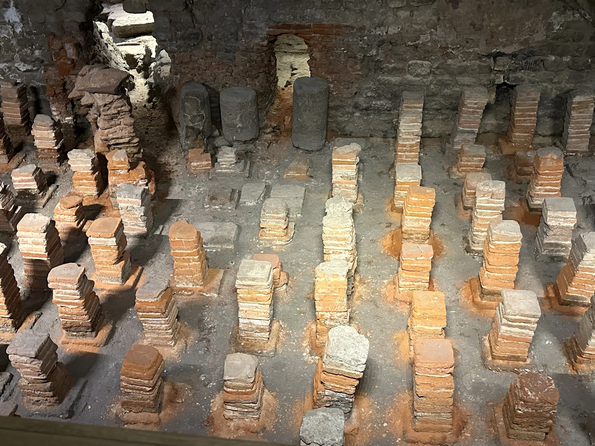 We saw these stacked tiles in several spots around the baths. Not quite sure what they were, we asked a guide. Interestingly, these tiles were intentionally placed in this manner outside of rooms that generated a lot of heat. With gaps between the pillars of tiles, heat could flow though and reach a room or heat a floor (if covered). It was a very efficient approach to heating